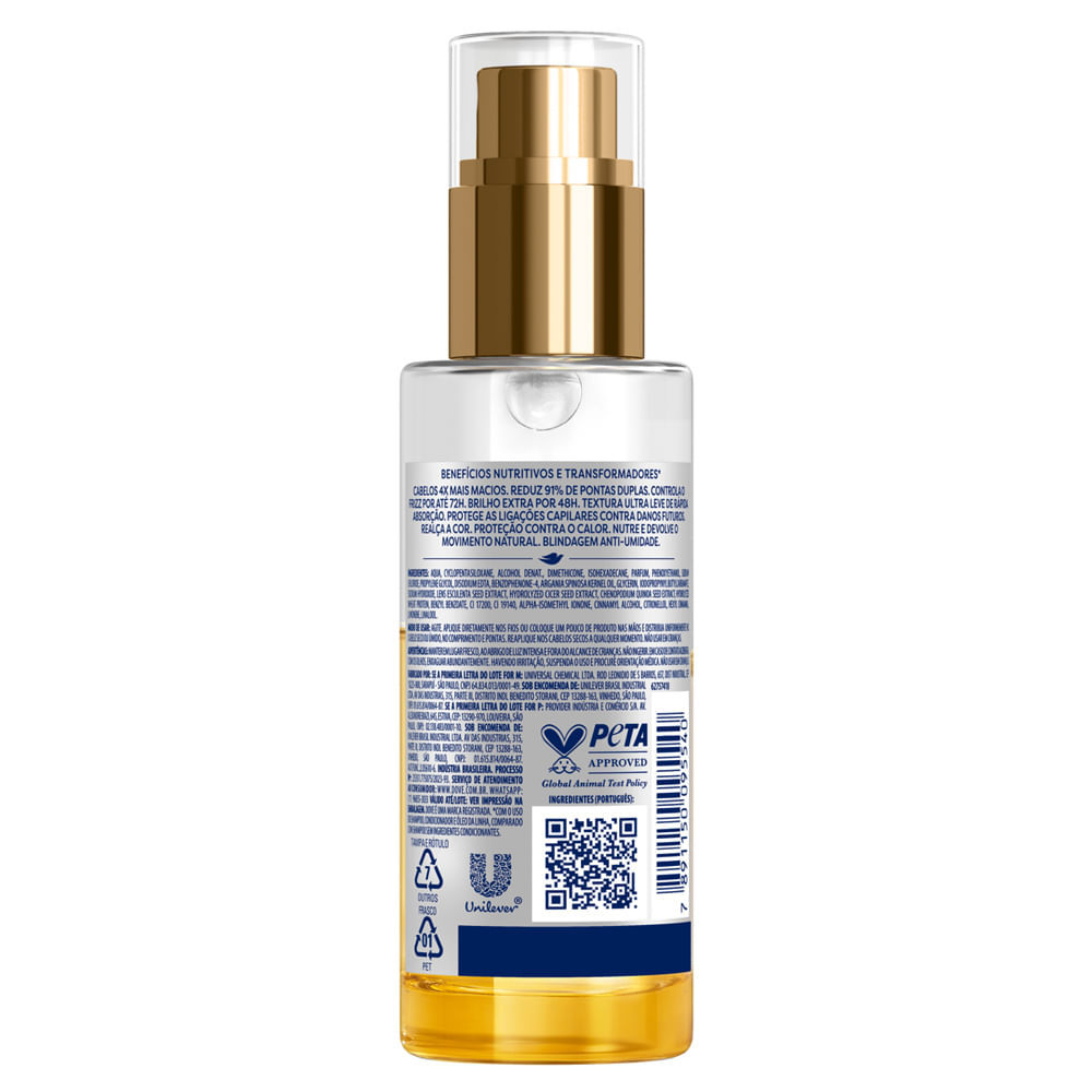 • O Óleo + Sérum Bifásico Dove Bond Intense Repair, infusionado com micromoléculas de óleos, nutre e realça a saúde dos fios • Possui a tecnologia patenteada Bio-Protein Care c