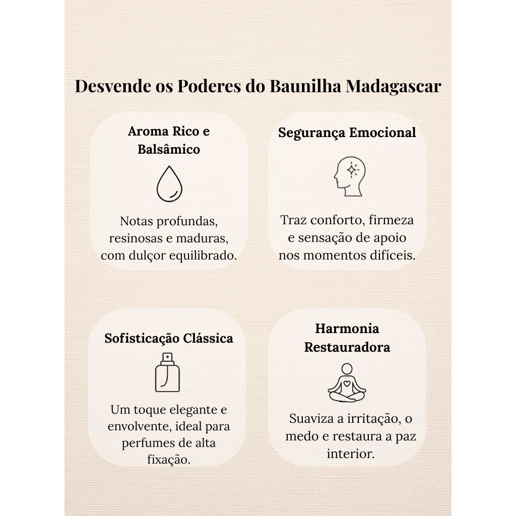 Nome Botânico: Vanilla planifolia (Var. Madagascar) País de Origem: Madagascar Método de Extração: Destilação fracionada a partir de compostos naturais Inspiração & Origem Nas ilhas do Oceano Índico, a Baunilha de Madagascar é cultivada com paciência e reverência. Conhecida como o "ouro negro" das especiarias, ela passa por um longo processo de cura ao sol que intensifica sua profundidade. Seu óleo essencial captura a alma da fava curada: um aroma sóbrio, amadeirado e profundo. É a essência da maturidade e da elegância — um convite a colocar os pés no chão, respirar com firmeza e encontrar segurança dentro de si. Descrição Sensorial Aroma rico e profundo, que combina a doçura clássica da baunilha com notas defumadas, amadeiradas e um toque de licor envelhecido. Transmite uma sensação imediata de nobreza e estabilidade, ideal para momentos que exigem foco, seriedade e tomada de decisão. Perfil Aromático: Topo: Notas quentes de fava curada, com leve toque de especiaria seca. Coração: Acordes amadeirados e defumados, que trazem profundidade e mistério. Base: Fundo balsâmico e terroso, evocando segurança e estabilidade emocional. Principais Benefícios Bem-estar emocional Promove ancoramento, segurança e estabilidade emocional Dissipa a dispersão mental e traz clareza para decisões Estimula a autoconfiança madura e a sofisticação interior Benefícios físicos Ação equilibrante do sistema nervoso central Auxilia na redução de tensões físicas causadas pelo estresse Favorece a concentração e o foco prolongado Uso cosmético Ideal para perfumes pessoais de toque elegante e unissex Perfuma com notas de madeira nobre e baunilha real Indicado para loções corporais de toque seco e aveludado Sugestões de Uso Difusores em escritórios ou salas de estudo para foco e elegância Blends com madeiras (Cedro, Sândalo) para potencializar a segurança Rituais de meditação para enraizamento (grounding) Aromatização de ambientes sociais para uma recepção sofisticada Precauções Uso externo. Não ingerir. Manter ao abrigo da luz e fora do alcance de crianças. Evitar contato com os olhos. Não utilizar durante gestação e lactação. Faça teste de sensibilidade antes do uso e não aplique puro diretamente na pele. Este produto é parte de uma terapia alternativa e não substitui acompanhamento médico. Qualidade 100% puro, natural e vegano. Sem aditivos, corantes ou solventes sintéticos. Produzido artesanalmente em pequenos lotes, com excelência olfativa e respeito à natureza. Essência da Experiência Sinta a profundidade da Baunilha Madagascar e permita que seu toque amadeirado traga estrutura à mente. Um aroma nobre que ancora, fortalece e define a verdadeira elegância é a sofisticação em sua forma mais pura.