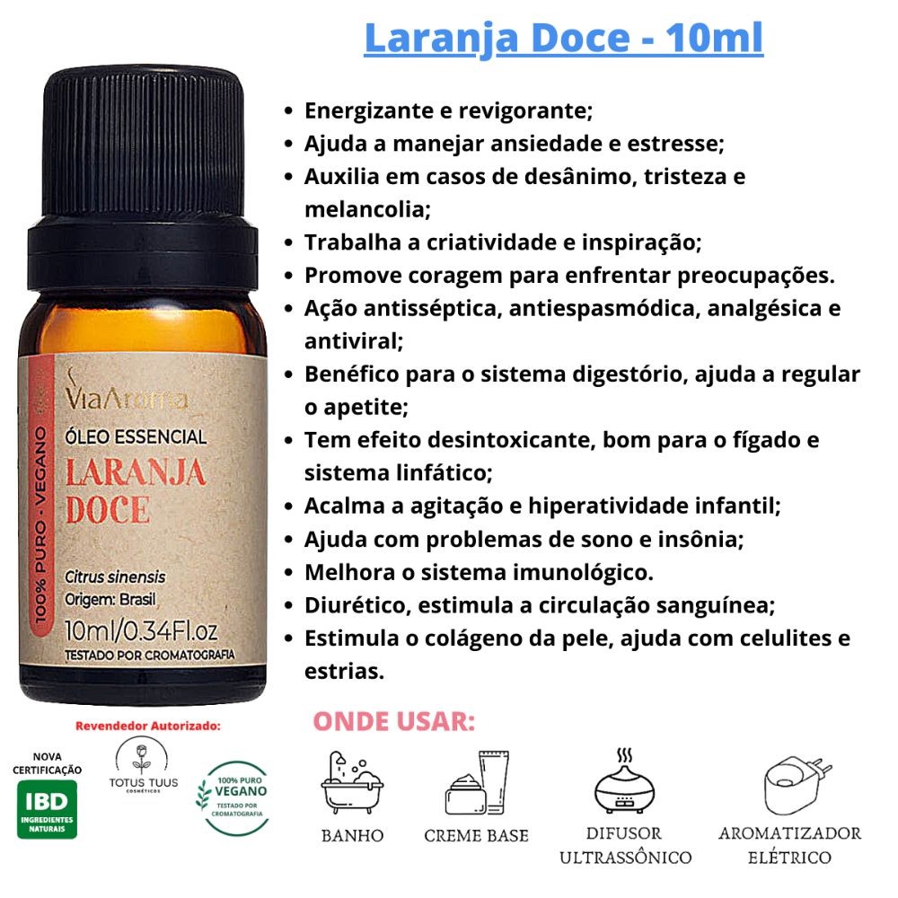 Os óleos essenciais Via Aroma têm sua origem na extração de plantas, incluindo flores, folhas, cascas e caules. As propriedades extraídas de cada planta são únicas e possuem características curativas utilizadas através da aromaterapia que nada mais é do que a terapia que visa à cura de uma indisposição mental ou física através do aroma. Por inalação, os óleos essenciais penetram em nosso organismo através do sistema respiratório trazendo benefícios físicos e emocionais. Esses óleos essenciais via aroma são analisados por cromatografia, oferecendo a garantia de um produto puro e 100% autêntico de plantas. Combine diferentes elementos da natureza para cuidar do corpo e da mente, promovendo um efeito único e de bem-estar para o seu dia a dia. Use a aromaterapia a seu favor e desfrute de momentos únicos. Contém 01 item: 100% natural 01 Óleo essencial Laranja Doce - 10ml - Via Aroma 01 Óleo essencial Tangerina - 10ml - Via Aroma A embalagem do produto é de vidro cor âmbar para proteger o conteúdo, o rótulo informa o aroma. Sugestão de como usar: Adicione 10 gotas de água (se preferir para diminuir a intensidade) e de 5 á 10 gotas* de óleo essencial Via Aroma no Aromatizador Elétrico. Armazenar em local bem ventilado, em embalagem fechada e protegido da luz. A Via Aroma recomenda a utilização dos óleos essenciais no aromatizador elétrico. SE PRECISAR TAMBÉM TEMOS DISPONÍVEIS ALGUNS MODELOS DE AROMATIZADORES PARA VENDA!!! Para outros tipos de utilização dos óleos essenciais, procure a orientação de um profissional habilitado e especializado em Aromaterapia, pois ele é a pessoa mais indicada para recomendar um óleo para você e a quantidade necessária, caso seja possível ingerir, porque precisa ser levado em conta a individualidade do organismo de cada pessoa. Lembre-se , sempre adquira produtos de qualidade e procedência garantida que somente uma empresa que esteja comprometida com seu bem estar e sua satisfação poderá fornecer. Somos a Totus Tuus, uma empresa constituída oficialmente desde 2014 e que está sempre em busca não apenas atender às suas necessidades, mas superar expectativas. PRONTA ENTREGA - ENVIAMOS PARA TODO BRASIL - PROCEDÊNCIA GARANTIDA - COM NOTA FISCAL - PRODUTOS ORIGINAIS – ÓLEOS ESSENCIAIS – AROMATERAPIA – ENVIO RÁPIDO Estamos sempre à disposição para sanar qualquer dúvida. Aguardamos seu pedido!
