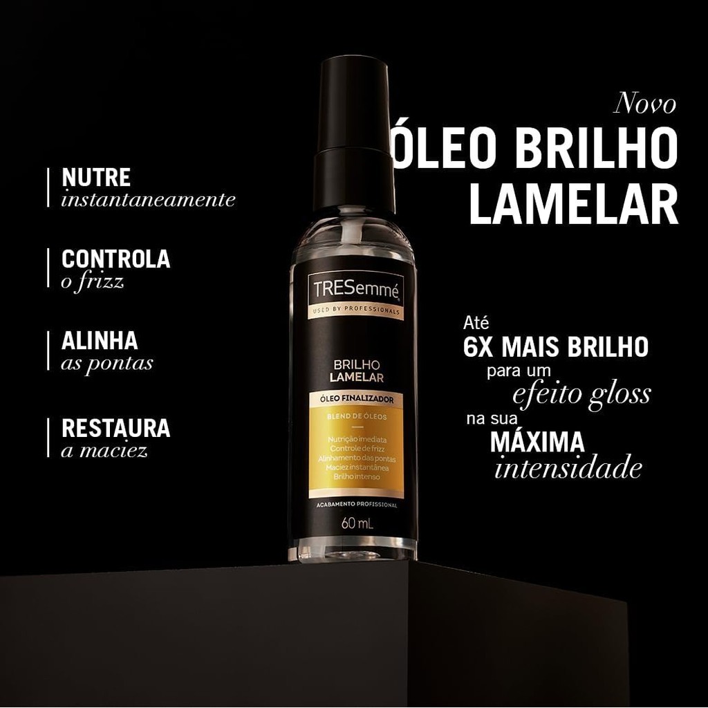 Conheça a nova linha TRESemmé Brilho Lamelar para cabelos com efeito gloss em sua máxima intensidade para cabelos com 7X mais brilho. Um revolucionário tratamento de salão, tendência internacional, agora em sua casa. O Óleo Finalizador Nutritivo TRESemmé Brilho Lamelar foi desenvolvido com fórmula profissional enriquecida com blend de óleos de macadâmia de coco que nutre, alinha as pontas e recupera a maciez e o brilho, para uma finalização profissional, com textura leve! Tenha o brilho que você sempre sonhou, deixando seus cabelos impecáveis. Surpreenda-se. A linha atende a todos os tipos de cabelo, do liso ao cacheado. A linha oferece: - Efeito gloss em sua máxima intensidade: a linha proporciona um efeito gloss deslumbrante, tendo um cabelo impactante e iluminoso desde o primeiro uso. - Revolucionária tecnologia Lamelar: com a tecnologia Lamelar inovadora, os fios serão tratados fortemente, destacando o brilho do cabelo e proporcionando nutrição superior imediata e uma correção instantânea das irregularidades capilares. - Nutrição superior imediata: a linha garante uma nutrição profunda e imediata aos cabelos, fornecendo os nutrientes essenciais para restaurar a saúde e a vitalidade de cada fio. Como usar Coloque um pouco de produto nas mãos e aplique uniformemente no cabelo seco ou úmido, no comprimento e pontas. Para potencializar o resultado, reaplique nos cabelos secos a qualquer momento.