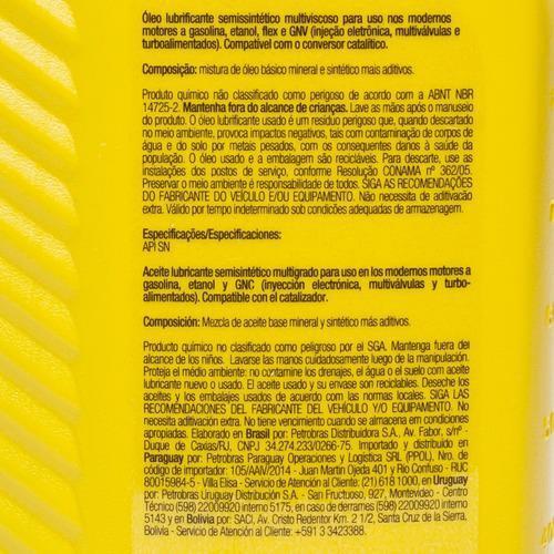 CONTEÚDO DA EMBALAGEM: 04 LITRO DE ÓLEO - 15W40 Lubrax Descrição Lubrificante premium semissintético com maior poder de limpeza e menor formação de depósitos nos cilindros e válvulas, Lubrax Tecno é recomendado para uso nos modernos motores a gasolina, etanol, flex e GNV de veículos nacionais ou importados com injeção eletrônica, multiválvulas e turboalimentados, sendo compatível com conversores catalíticos. Características Marca: Lubrax BR Classificação: API SN Viscosidade: 15W-40 Tipo de óleo de motor: Semissintético Categoría de serviço: Automotivo Origem: Brasil Volume do óleo de motor: 4 L Tipo de recipiente: Garrafa