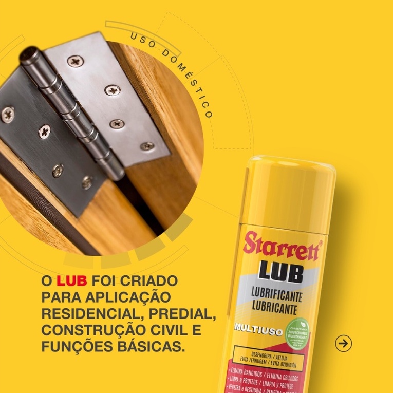 Somos a BZ MATERIAIS PARA CONSTRUÇÃO. TODOS OS PRODUTOS ESTÃO DISPONÍVEIS PARA ENVIO IMEDIATO, SÃO NOVOS E ACOMPANHAM NOTA FISCAL. Qualquer dúvida entre em contato conosco. ---------------------------------------------------------------------- - O Lub Starrett foi criado para quem busca agilidade e qualidade na aplicação industrial, residencial e predial. Com uma fórmula mais simplificada e focadas nas funções básicas para lubrificar, desengripar e proteger peças e superfícies. - Disponível em lata aerossol de 300ml, o Lub Starrett conta ainda com uma base mineral e vegetal, além de uma suave fragrância de baunilha. ESPECIFICAÇÕES: - Cor: Âmbar - Odor: Agradável (Baunilha) - Densidade: 0,8727 a 68° F (20° C) - Viscosidade: 13,66 cSt (centiStokes) equivalente a 70 SUS (viscosidade segundo Saybolt) a 40ºC - Ponto de fulgor: 60°C (vaso fechado) - Ponto de fluidez: <-40° C