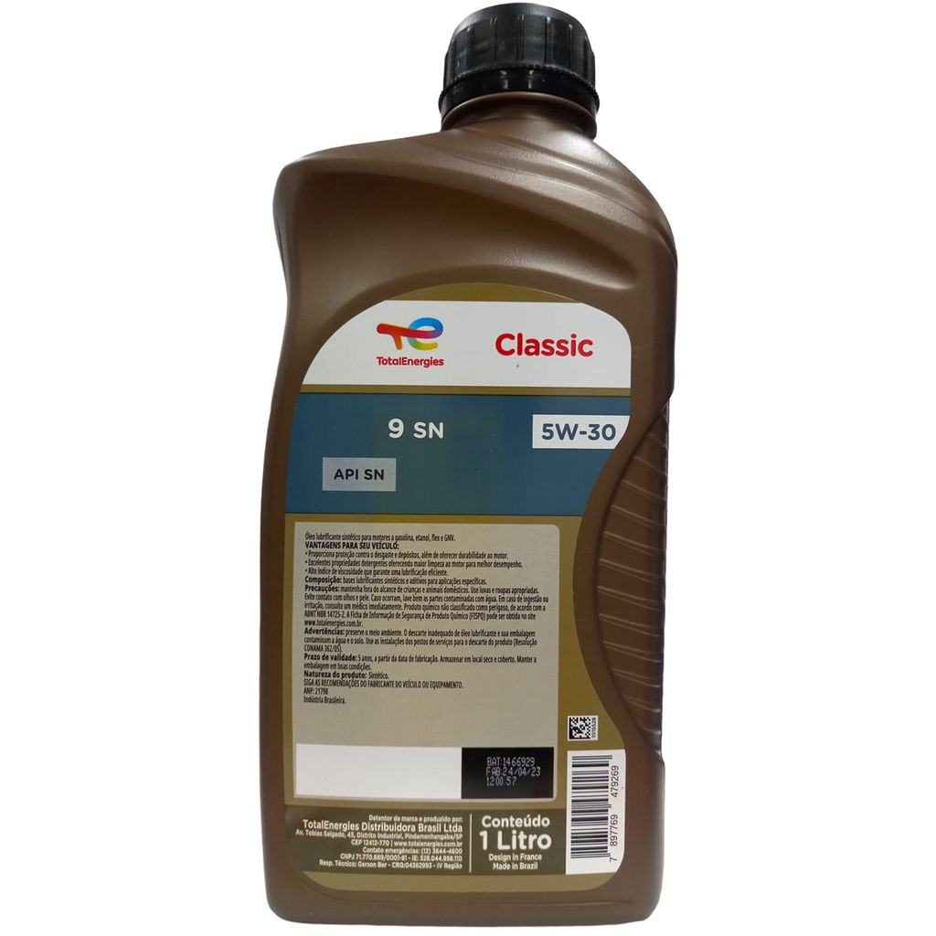 Óleo Lubrificante do Motor 100% Sintético 5w30 API SN Classic - Total Código do produto: 230103 ANP: 21798 Classic 9 SN 5W30 é Lubrificante sintético de última geração para óleos de motores destinado à lubrificação de motores à Gasolina, Etanol, Flex e GNV. Vantagens -Proporciona Porteção contra desgaste e depósitos, além de oferecer durabilidade ao motor. -Excelentes propriedades detergentes oferecendo maior limpeza ao motor para melhor desempenho. -Alto índice de viscosidade que garante uma lubrificação eficiente.