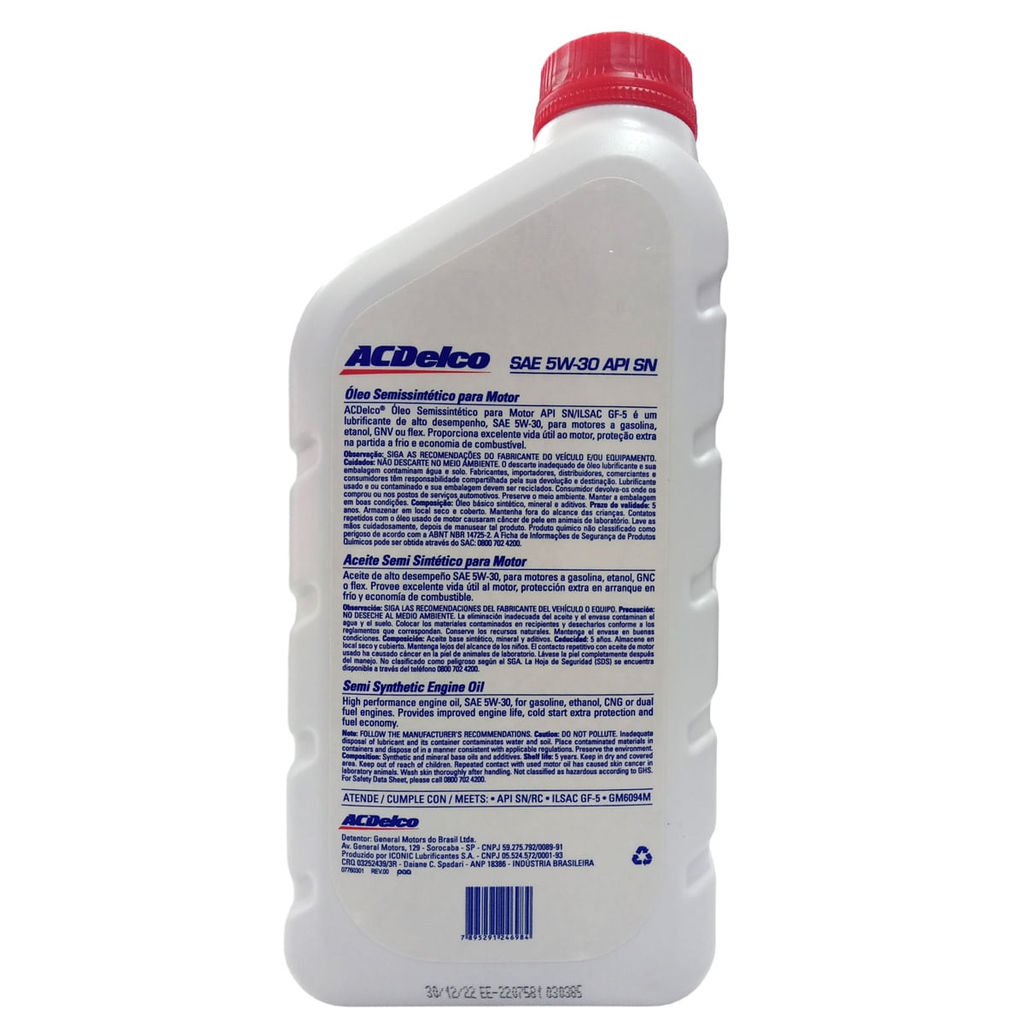 | Óleo Lubrificante do Motor ACDelco SAE 5W30 API SN Semissintético 1L este produto | R$ 57,92 | — | 5.0/5 | — |