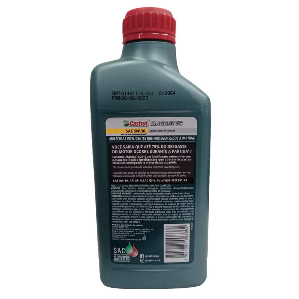 Magnatec 5W30 Móleculas inteligentes que protegem desde a partida. DESCRIÇÃO: Até 75% do desgaste do motor ocorre durante o seu aquecimento. Quando é desligado, todo o óleo é drenado para o cárter, mas as moléculas inteligentes do Castrol MAGNATEC não. Elas se agarram às partes críticas do motor como um imã, fornecendo uma camada extra e permanente de proteção. A formulação do Castro MAGNATEC protege o motor desde o momento em que você o liga, reduzindo drasticamente o desgaste, para uma proteção que você pode ver, ouvir e sentir. Castrol MAGNATEC. Proteção instantânea desde a partida. Conforme testado no teste de desgaste Sequência IVA, da indústria. APLICAÇÃO: Castrol MAGNATEC 5W30 é adequado para uso em motores gasolina, álcool, flex, GNV e veículos híbridos, onde o fabricante recomenda um lubrificante API SP, ILSAC GF-L (ou anterior), SAE 5W30. BENEFÍCIOS: Moléculas Inteligentes Castrol MAGNATEC - Permanece nas peças do motor, mesmo após o desligamento - Adere as superfícies metálicas para tornar as peças do motor mais resistentes ao desgaste - São combinadas com tecnologia sintética para fornecer maior proteção em aplicações severas, de alta e baixa temperatura - Fornece proteção contínua para diferentes tipos de condução, estilos e temperaturas - Contribui na economia de combustível e emissões mais limpas - Ajuda a evitar o processo de pré-ignição em baixas velocidades