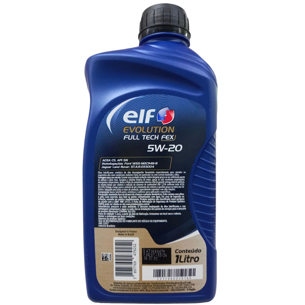 Óleo para Motor Api SN 5w20 100% Sintético para motores movidos a Gasolina, Flex, GNV e Diesel Leve com DPF Código do produto: 231766 ANP: 22057 Marca: ELF Óleo Lubrificante sintético de alto desempenho formulado especialmente para atender os requisitos dos mais modernos motores Ford, em particular os com correias banhada a óleo. ACEA C5 - API SN Homologações: Ford WSS-M2C948-B Jaguar Land Rover: STJLR.03.5004