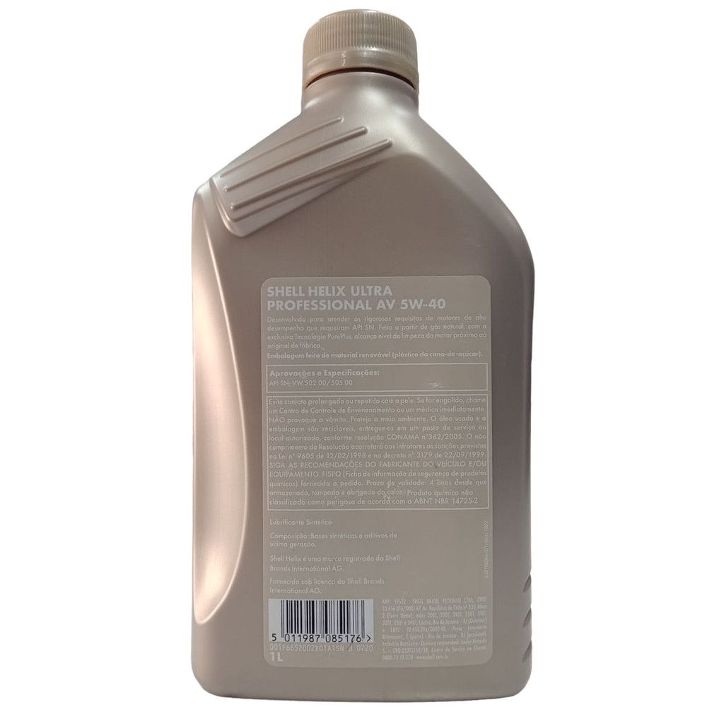 Óleo Lubrificante do Motor Shell Helix Ultra Professional AV 5W40 para Motores a Gasolina/Flex/Diesel 1L Código do produto: 41053905 ANP: 19522 O Shell Helix Ultra Professional AV 5W40 foi desenvolvido para atender os rigorosos requisitos de motores de alto desempenho que requeiram API SN. Feito a partir de gás natural, com a exclusiva Tecnologia Pure Plus, alcança o nível de limpeza do motor próximo ao original de fábrica. Embalagem feita de material renovável (plástico de cana-de-açúcar). Aprovações e Especificações: API SN; VW.502.00/505.00 Evite contato prolongado ou repetitivo com a pele. Se for engolido, chame um Centro de Controle de Envenenamento ou um médico imediatamente. NÃO provoque vômito. Proteja o meio ambiente. O óleo usado e a embalagem são recicláveis, entregue-os em um posto de serviço ou local autorizado, conforme resolução: CONAMA nº 362/2005. O não cumprimento da resolução acarretará aos infratores sanções previstas na Lei nº 9605 de 12/02/1998 e no decreto nº 3179 de 22/09/1999. SIGA AS RECOMENDAÇÕES DO FABRICANTE DO VEÍCULO E/OU EQUIPAMENTO. FISPQ (Ficha de informação de segurança de produtos químicos) fornecida a pedido. Prazo de validade: 4 anos desde que armazenado, tampado e abrigado do calor. Produto químico não classificado como perigoso de acordo com a: ABNT NBR 14725-2 Lubrificante Sintético Composição: Bases sintéticas e aditivos de última geração. Shell Helix é uma marca registrada da Shell Brands International AG. Fornecido sob licença da Shell Brands International AG. Contém 1 litro.