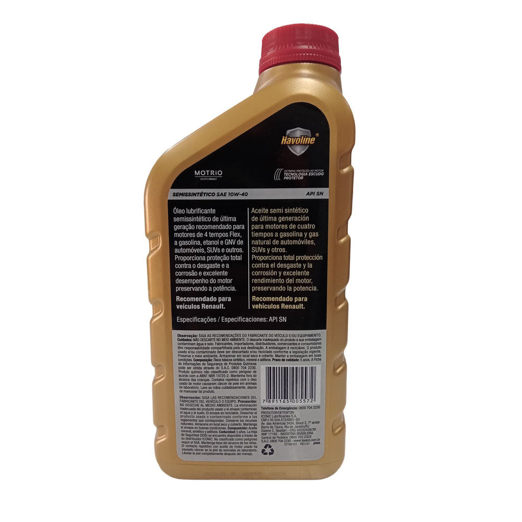 Óleo lubrificante de última geração recomendado para motores de 4 tempos Flex, a gasolina, etanol e GNV de automóveis, SUVs, pickups, comerciais leves, equipamentos móveis e estacionários. Código do produto: TX31428753 ANP:17195 Sua fórmula combina óleos básicos sintéticos e minerais de alto desempenho e aditivos de avançada tecnologia criando um Escudo Protetor que proporciona: • proteção total contra o desgaste e a corrosão, • maior vida útil do motor, • excelente desempenho do motor preservando a potência, • redução da emissão de gases poluentes e consumo de óleo, protegendo o meio ambiente, • excepcional limpeza do motor.