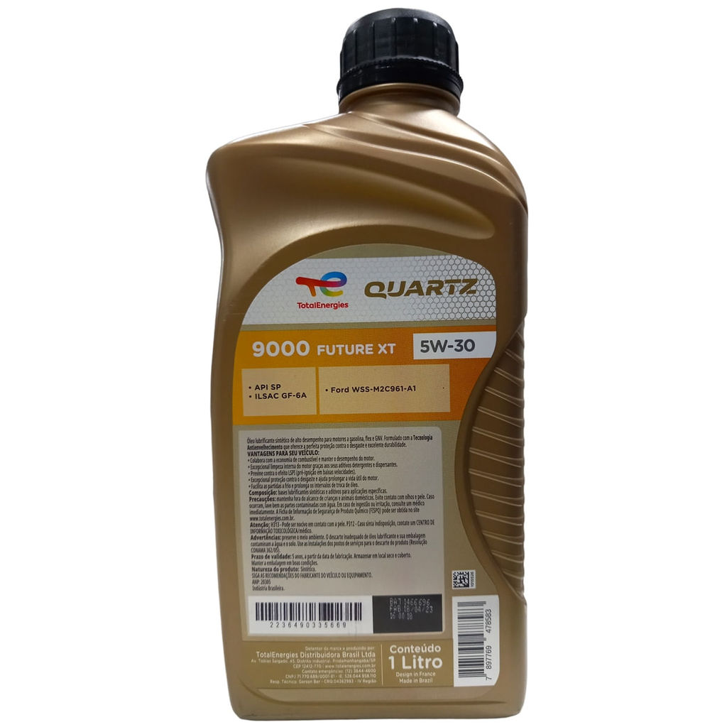 Óleo para Motor Total Quartz 9000 Future XT 5W30 Sintético Api SP ILSAC GF-6A 1L INDICADO PARA MOTORES A GASOLINA, ETANOL, FLEX, GNV SAE 5W-30 ÓLEO SINTÉTICO FUEL ECONOMY VANTAGENS CLIENTES • Redução do impacto ambiental: Desempenho FUEL ECONOMY significativo medido pelo teste oficial ILSAC : sequência VI D (ASTM D7589). Atende todos os níveis de performance e padrões ambientais exigidos por marcas como HONDA, TOYOTA e MITSUBISHI. • Proteção para sistemas de controle de poluição: Com seu baixo teor de fósforo, este lubrificante protege os conversores catalíticos de três vias , impedindo-os de serem danificados por envenenamento. Isto reduz as emissões de NOx, HC e CO em particular. • Limpeza e proteção do motor: Este óleo oferece a melhor proteção possível em sua categoria contra o desgaste e depósito logo na partida do motor. • Partidas a frio mais fáceis: Este grau de viscosidade, juntamente com aditivos especiais, faz com que o motor frio parta mais fácil, mesmo em baixas temperaturas. • Intervalos de troca: Para ver os intervalos de troca; consulte sempre o manual do carro. • Evita o efeito LSPI, pré ignição em aixas velocidades • Economia de combustível melhorada quando comparado à especificações ILSAC GF-5 • Maior proteção à correntes de comandos, borra, proteção superior à comando de válvulas e depósitos no pistão etec. (Seq. VI, III, V, IV) API : API SP ILSAC : ILSAC GF-6A Approved : FORD : WSS-M2C961-A1 Óleos de motor com tecnologia sintética que proporcionam a melhor proteção contra desgaste e contra depósitos. Os sistemas de pós-tratamento para motores a gasolina, que são sensíveis aos lubrificantes usados e caro para manter, também são protegidos ao longo prazo graças ao baixo teor de fósforo do produto. Este óleo de motor reduz o atrito interno dentro do motor tanto quanto possível para que ele possa entregar potência máxima, ao mesmo tempo que gera economia de combustível. ESPECIFICAÇÕES ? API SP ? ILSAC GF-6A ? Compatível com API SN PLUS, SM, SL & ILSAC GF-5 e anteriores APROVAÇÕES EM OEMs FORD WSS-M2C941-A1 Atende aos requisitos de muitos outros fabricantes Americanos e Asiáticos. Óleos de motor com tecnologia sintética que proporcionam a melhor proteção contra desgaste e contra depósitos. Os sistemas de pós-tratamento para motores a gasolina, que são sensíveis aos lubrificantes usados e caro para manter, também são protegidos ao longo prazo graças ao baixo teor de fósforo do produto. Este óleo de motor reduz o atrito interno dentro do motor tanto quanto possível para que ele possa entregar potência máxima, ao mesmo tempo que gera economia de combustível. ESPECIFICAÇÕES API SP ILSAC GF-6A Compatível com API SN PLUS, SM, SL & ILSAC GF-5 e anteriores APROVAÇÕES EM OEMs FORD WSS-M2C941-A1 Atende aos requisitos de muitos outros fabricantes Americanos e Asiáticos.