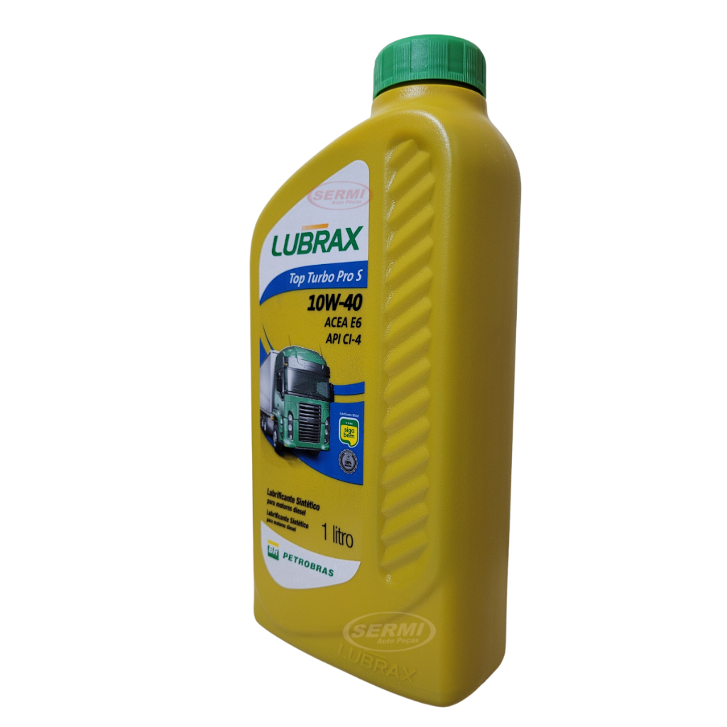 LUBRAX TOP TURBO PRO S Lubrificante Sintético para motores diesel Descrição: Óleo lubrificante sintético multiviscoso para uso em motores a diesel turbinados, em serviços severos. Possui elevado controle de viscosidade e oxidação, proporcionando excelente limpeza do motor e permitindo aumento do período de troca e redução dos custos operacionais, conforme a recomendação do fabricante do equipamento. Cumpre e supera os requisitos de performance exigidos por motores Euro V, Euro III e anteriores. Aplicações: Lubrax Top Turbo Pro S é recomendado para uso em motores diesel de caminhões, ônibus e equipamentos fora-de-estrada equipados com sistema de tratamento de gases de escape como EGR (Sistema de Recirculação de Gases), entre outros. Indicado para veículos em serviços rodoviário, urbano ou fora de estrada, tais como VOLKSWAGEN, MAN, SCANIA, DAF, MERCEDES-BENZ, entre outros. Especificações e Classificações: Lubrax Top Turbo Pro S atende aos seguintes níveis de desempenho: • ACEA E6/E7-16 • API CI-4 • MAN M 3477, MAN M 3271 • Volvo VDS-3 • Cummins CES 200076, 20077 • MTU Tipo 3.1 • Mack EO-N • Renault Trucks RLD-2 Viscosidade SAE 10W-40 Contém: Frasco de 1 Litro Lubrax - Petrobras