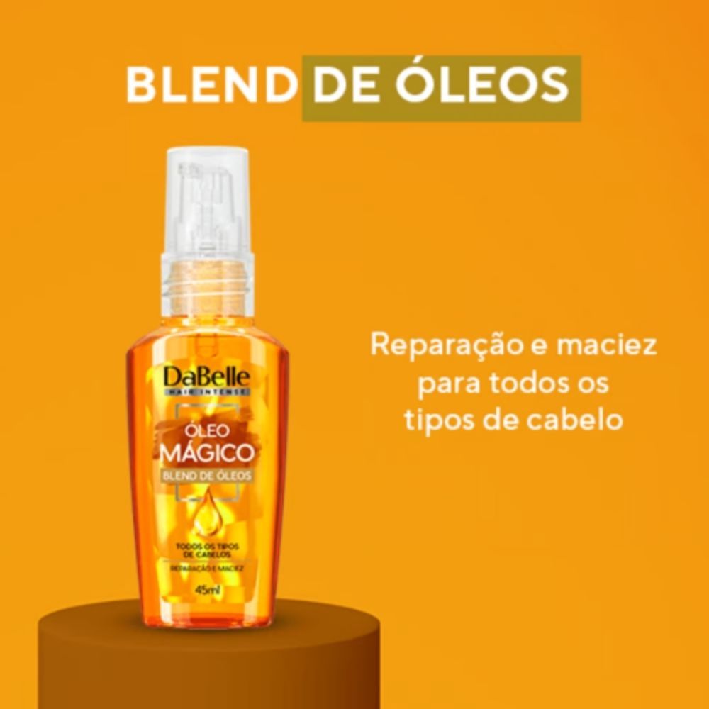 Óleo Mágico DaBelle Blend de Óleos Reparação e maciez Suaviza a porosidade e condiciona Protege contra agressões diárias Evita o emborrachamento dos fios Proporciona brilho Nutre e repara os fios Tipo