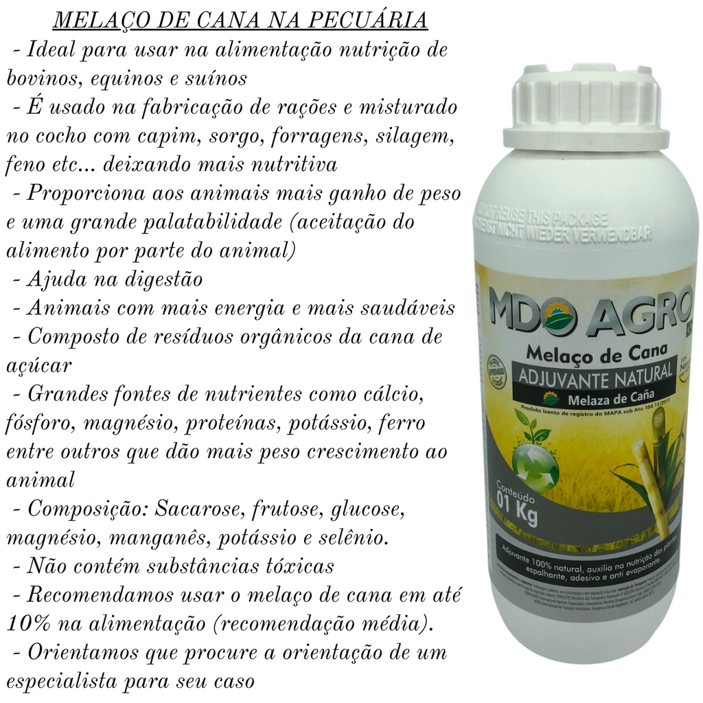 A Ppc Store é uma empresa que zela pela qualidade de seus produtos e a satisfação de nossos clientes amigo/as. Óleo MELAÇO DE CANA natural orgânico sustentável concentrado para diluição. Produto de EXTREMA qualidade. ÓLEO MELAÇO DE CANA é um subproduto orgânico natural que provém da cana de açúcar, onde começa pela colheita passando pelo preparo e a moagem e por fim o caldo é tratado para a extração do melaço de cana. É considerado um grande fertilizante potencializador para adubação do solo e um grande nutritivo para animais da pecuária. Possui muitas grandes fontes de nutrientes. ATENÇÃO: NÃO é utilizado para consumo humano nem de animais domésticos. INDICADO para uso agrícola e pecuária. MELAÇO DE CANA NA AGRICULTURA O óleo de melaço de cana é concentrado puro (é preciso fazer a devida diluição conforme indicamos mais abaixo). IDEAL para todos os tipos de agricultura, grandes plantações (soja, mandioca, milho, café e etc…) hortas (alface, tomate, cebola, cenoura, pimentas, espinafre, ervilhas, entre todas outras) , plantas, frutos (uva, morango, laranja, mexerica, melancia, maçã, mamão e muitas outras) árvores frutíferas, jardins pomares e indoor. NUTRIÇÃO para todos os tipos de cultura. COMPOSTO de resíduos orgânicos de cana de açúcar. AUMENTA a nutrição do solo, crescimentos das folhas, plantas mais fortes, bonitas e saudáveis. GRANDES fontes de nutrientes como cálcio, fósforo, magnésio, proteínas, potássio, ferro entre outros que dão mais vida a toda plantação. MUITO importante nas fases vegetativas e reprodutivas das plantações. EXCELENTE adubo natural e fertilizante agrícola. INFLUÊNCIA na reprodução dos microrganismos composto no solo no qual as plantações irão se beneficiar utilizar. ELEVADOR do brix (doçura dos frutos) proporciona frutos maiores e bonitos. AUXILIA na melhoria da adubação do solo, melhora o enraizamento, estimulante das folhas, nutrir o solo, fertilização orgânica. POTENCIALIZA defensivos agrícolas, potencializa a eficiência dos herbicidas, fungicidas e inseticidas. AUXILIA contra pragas, insetos, larvas, moscas, mosquitos, pulgões, ácaros, cochonilhas, cigarrinhas, lagartas, percevejos, fungos entre muitos outros. ATIVADOR nutricional. COMPOSIÇÃO sacarose, frutose, glucose, magnésio, manganês, potássio e selênio. NÃO contamina inimigos naturais das pragas. NÃO polui o meio ambiente nem sua propriedade. NÃO afeta os polinizadores nem os inimigos naturais por ser um princípio orgânico natural. NÃO contém elementos químicos. EVITE aplicar próximo a aquários. QUANDO aplicado em frutas e verduras, consumir após 2 dias ou mais. MELAÇO DE CANA NA PECUÁRIA IDEAL para usar na alimentação de bovinos, equinos e suínos. USADO na fabricação de rações e misturado do cocho com capim, sorgo, forragens, silagens, feno entre outros, deixando mais nutritivo. PROPORCIONA aos animais mais ganho de peso e uma grande palatabilidade (aceitação do alimento por parte do animal). AJUDA na digestão. ANIMAIS com mais energia e mais saudáveis. COMPOSTO de resíduos orgânicos da cana de açúcar. GRANDES fontes de nutrientes como cálcio, fósforo, magnésio, proteínas, potássio, ferro entre outros que dão mais peso crescimento ao animal. COMPOSIÇÃO sacarose, frutose, glucose, magnésio, manganês, potássio e selênio. NÃO contém substâncias tóxicas. 100% natural orgânico sustentável. NÃO precisa de receituário. COMO USAR! MODO DE USO NA AGRICULTURA O melaço de cana é concentrado precisa ser diluído em água. AGITE muito bem antes do seu uso. APLICAR a cada 15 dias em suas semeações. APLICAR sempre em horários de sol baixo fim de tarde ou à noite (como o produto é feito do óleo, se for aplicado a uma temperatura muito alta, pode queimar agredir as folhas). NÃO aplicar em dias chuvosos. NÃO reutilizar a embalagem. APLICAÇÃO COM ÁGUA PULVERIZAÇÃO AGRÍCOLA VIA TERRESTRE APLICAR 1 kg por hectare (se sua plantação estiver bem desnutrida pode aplicar até 2kg por hectare). APLICAÇÃO em bombas de 20 litros pode aplicar de 20ml a 40ml. APLICAÇÃO em bombas de 5 litros pode aplicar de 8ml a 12ml. APLICAÇÃO indoor, casa, planta, jardim, horta, 1 litro pode aplicar 2ml a 4ml. MODO DE USO NA PECUÁRIA PODE ser utilizado na fabricação de rações e misturado do cocho com capim, sorgo, forragens, silagens, feno entre outros, deixando mais nutritivo. RECOMENDADO utilizar o melaço de cana em até 10% na alimentação (recomendação média). ORIENTAMOS que procure um especialista para o seu caso. Ele sim vai te dar a dosagem correta perante seus animais. Óleo MELAÇO DE CANA tem suas seguintes características: Conteúdo: 1kg (média de 1 litro, pois é um produto denso pode dar uma leve variação) Líquido concentrado Peso: 1kg Tampa rosqueável bem travada Altura: 24 cm Largura: 8 cm