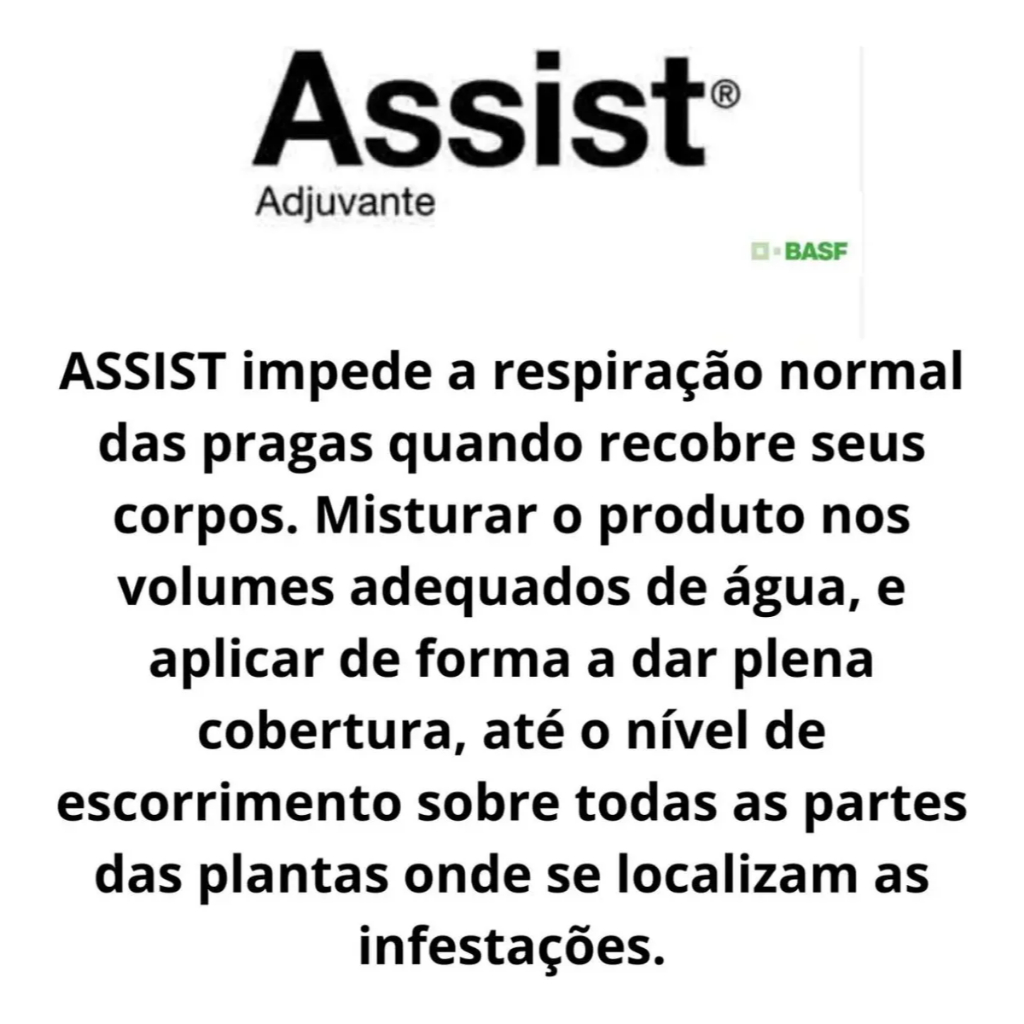 Descrição do Produto: A adição de Assist à calda de aplicação que necessitam de óleo mineral para boa performance, diminui os efeitos das condições adversas, como lavagem pela chuva, evaporação e deriva. Assist promove melhor distribuição da calda sobre as superfícies tratadas, diminui a tensão superficial e facilita a penetração. __________________________________________________________________________________________________________ COMPOSIÇÃO DO PRODUTO: (ÓLEO MINERAL)...............................................756 g/L (75,6% m/v) Outros ingredientes..........................................97 g/L (9,7% m/v) __________________________________________________________________________________________________________ Dosagem: 3 ml para 1 L. de água. _____________________________________________________