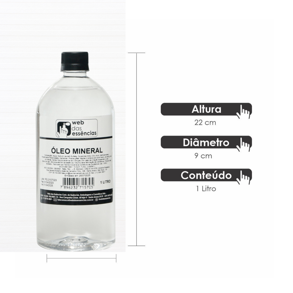 Óleo Mineral 1 Litro Óleo mineral (Grau USP - Farmacêutico) é ideal na utilização de formulações cosméticos, . Possui propriedades hidratantes e calmantes para a pele. Indicado para óleos de banho e lubrificação em geral. Indicado utilização de essência a 1%. O óleo mineral é utilizado em uma variedade de produtos cosméticos, incluindo: Hidratantes corporais . ° Loções para o corpo ° Óleos de massagem ° Produtos de banho ° Produtos para cabelo, como condicionadores e óleos capilares ° Maquiagem, como bases líquidas e batons ° Produtos para cuidados com os lábios - Produto em estoque - Envio imediato - Compra 100% segura e com garantia - Suporte com o nosso time para tirar dúvidas Conteúdo: 1 frasco contendo 1 litro de produto. Você está adquirindo um produto elaborado e fabricado dentro das normas e legislações da ANVISA. Foto meramente ilustrativa, podendo haver alterações