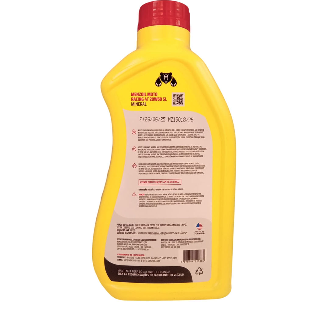 Óleo Mineral Para Moto Racing 4T 20W50 - 1L Menzoil Código: 010201005 Especificacoes: Api Sl, Jaso Ma2 Óleo Lubrificante mineral multiviscoso indicado para motores 4 tempos de motocicletas, motonetas, triciclos e quadriciclos nacionais e importados que trafegam em regimes moderados ou “STOP AND” muito comum em trânsitos urbanos, também pode ser utilizado para veículos movidos a gasolina, álcool, GNV ou bicombustíveis. Atende especificações: API SL JASO MA2 Benefícios x Características: Facilita a partida a frio do motor, protege contra desgaste, corrosão, proporciona trocas de marchas com suavidade. Composição Mineral Embalagem 1 LITRO