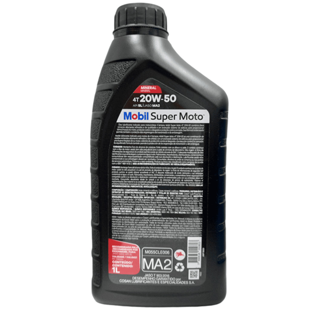 Óleo Mobil Super Moto 4t Mineral 20w50 - 1l Código do produto: 123073 ANP:16600 Óleo lubrificante indicado para motocicletas 4 tempos, Mobil super moto 4tempos, Mobil Super Moto 4T 20W-50 combina óleos minerais altamente refinados e de qualidade e um avançado no sistema de aditivos para proporcionar ótima limpeza do motor, proteção contra o desgaste e proteção contra corrosão. Sua fórmula balanceada permite também a proteção das engrenagens de transmissão e da embreagem.