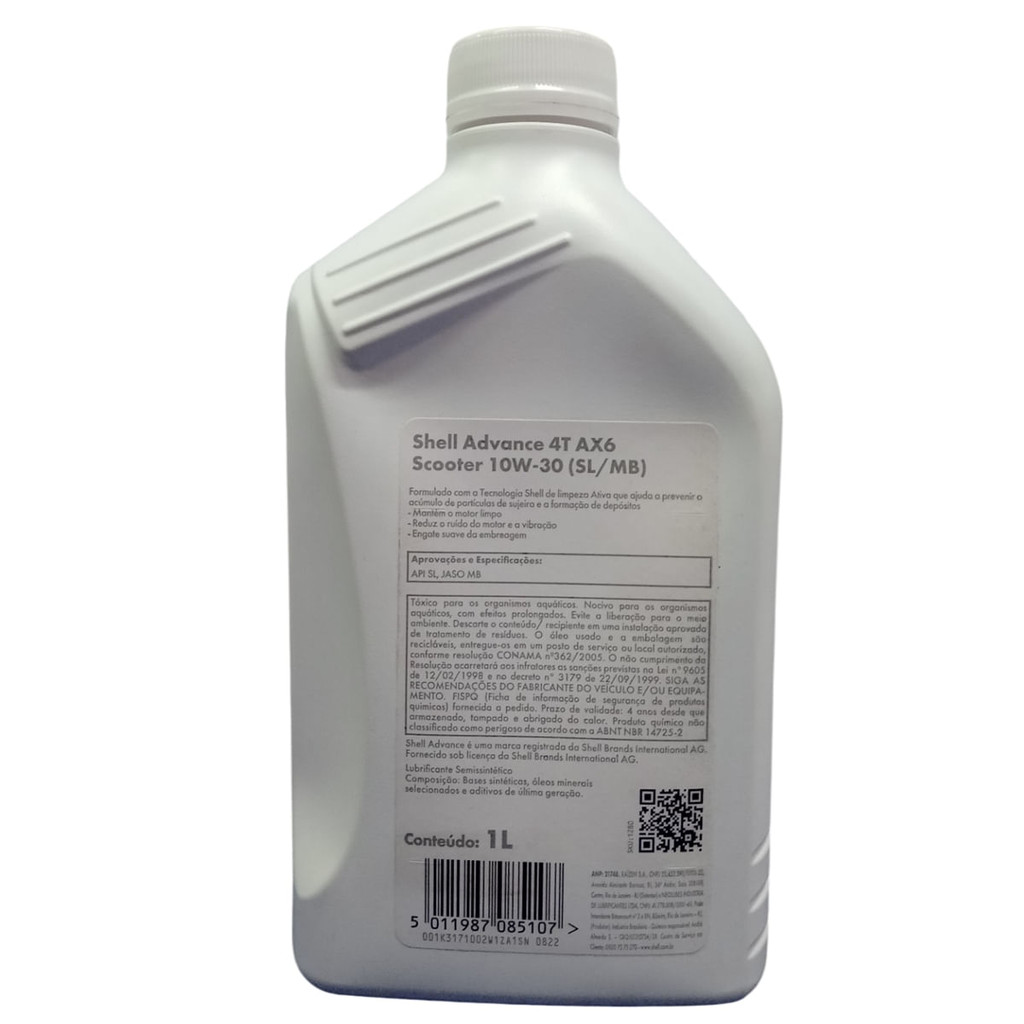 Óleo Motor Advance 4T AX6 Scooter 10W30 Sintético - 1L - Para motores de motocicleta Código: 44763905 Marca: Shell Formulado com a tecnologia Shell de limpeza Ativa que ajuda a prevenir o acúmulo de partículas de sujeira e a formação de depósitos. - Mantém o motor limpo - Reduz o ruído do motor e a vibração - Engate suave da embreagem Aprovações específicas: API SL, JASO MB