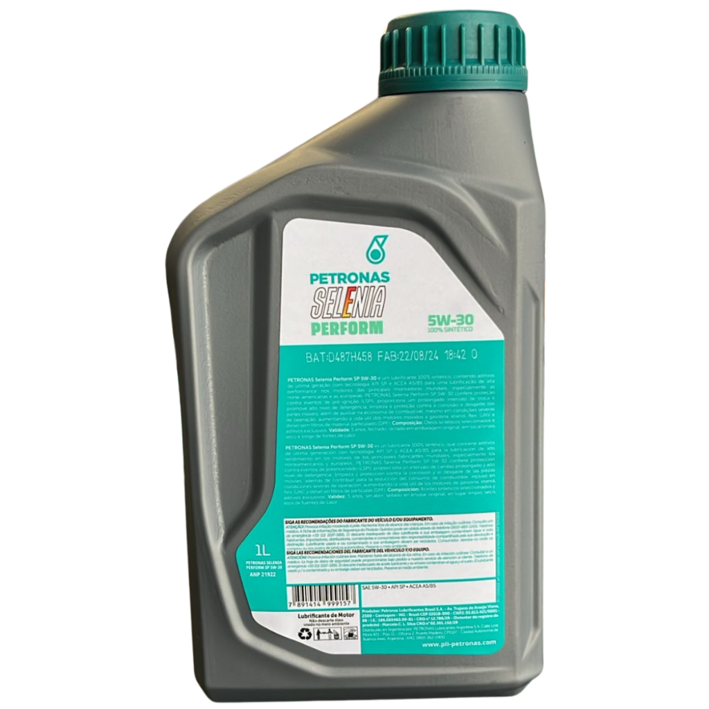 PETRONAS SELENIA PERFORM SP é um lubrificante 100% sintético contendo aditivos de última geração com tecnologia API SP e ACEA A5/B5 para uma lubrificação de alta performance nos motores dos principais fabricantes mundiais, especialmente os norte-americanos e europeus. PETRONAS SELENIA PERFORM SP possui um alto nível de limpeza e proteção contra corrosão e desgaste do motor, aumentando a vida útil dos motes. APLICAÇÃO: Veículos movidos a GASOLINA, ETANOL, FLEX e GNV. ATENÇÃO: O lubrificante API SN PLUS foi DESCONTINUADO pela Petronas, será enviado o API SP. ESPECIFICAÇÕES: API SP ACEA A5/B5 100% Sintético ITENS INCLUSOS: 01 - Petronas Selenia Perform 5w30