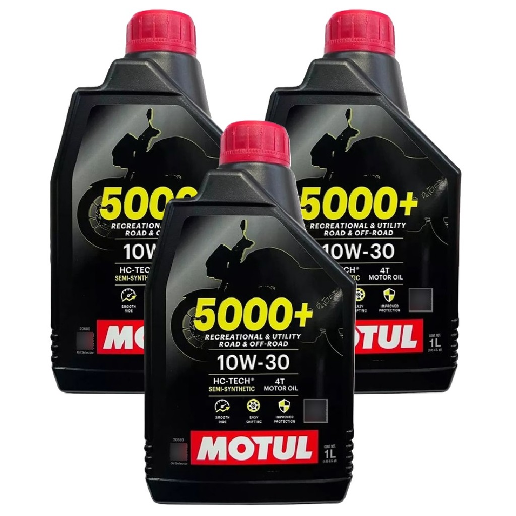 Óleo Motul 5000+ 10W30 Semissintético 4 Tempos Conteúdo da Embalagem: 02 Litros de Óleo 5000+ 10w30 Semissintético Especificações: - Aplicação: Lubrificantes para Motor - Tipo de motor: 4 Tempos - Qualidade: Semissintético - Viscosidade: 10W30 - Normas API SN - Homologações: JASO MA2 com N° M033MOT143 - Qualidade: HC-TECH® O MOTUL 5000+ 10w30 Lubrificante semissintético reforçado com óleos básicos HC-TECH® para garantir a proteção das peças do motor e melhorar a durabilidade das engrenagens do câmbio. Lubrificante para motos de estrada, todo terreno, enduro, trilhas, entre outras, equipadas com motores 4 tempos com caixa de câmbio integrada ou não e embreagem úmida ou seca. Indicado para motores projetados para utilizar lubrificantes de baixa viscosidade que respondam às normas Euro II ou Euro III, com sistemas de pós-tratamento de gases do escapamento: catalisadores, injeção de ar no escapamento. Homologação JASO MA2 oferece os níveis de atrito mais eficazes para garantir o acoplamento da embreagem durante 3 momentos chave na condução: partida, aceleração e velocidade constante.