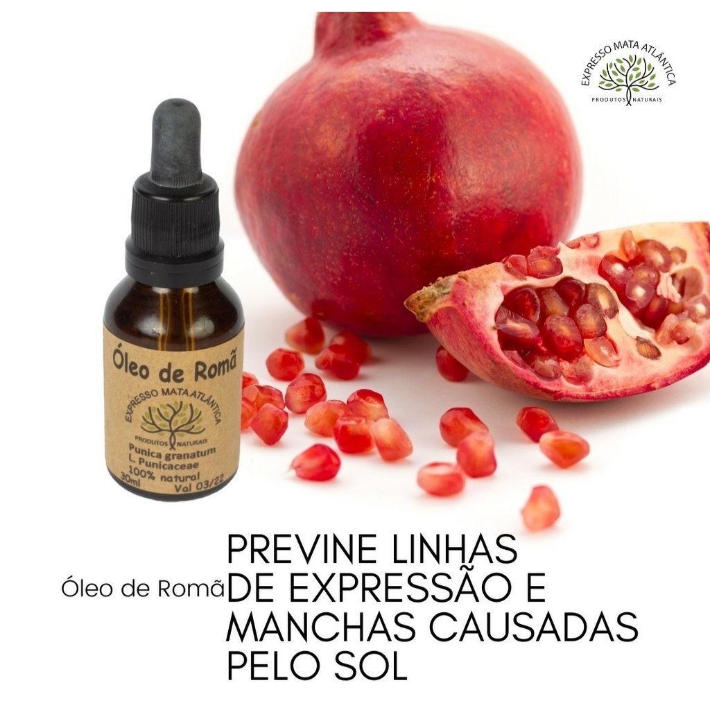 ANVISA: 3529906012060000016 INPI: 919152767 O óleo de Romã da Expresso Mata Atlântica, é um Produto 100% natural e Vegano. Sem petroquímicos, sulfatos, parabenos e sem corantes artificiais. O Óleo de Romã é extraído da semente da Punica Granatum. Rico em potássio, Polifenóis como o ácido elágico, que é um antioxidante. É carregado de vitaminas A, C, B5 e ácidos graxos como linoleico e oleico, que mantém a barreira cutânia. Seu óleo conhecido como poderoso antioxidante, previne sinais e linhas de expressão. estimulando a regeneração dos tecidos e melhorando a elasticidade da pele. Devido a presença de ácido elágico, se torna um potencializador de protetores solares contra os raios UV. Também evita a proliferação de melanócitos, que significa que previne manchas causadas pelo sol. É um dos 5 óleos que não pode faltar em nenhuma casa. Para quem sofre com acne, ele é anti-inflamatório e antibacteriano. Controla a oleosidade e clareia manchas deixadas por cravos e espinhas. O Ácido Púnico presente no óleo, cicatriza feridas e promove síntese de proteínas como colágeno, para sustentar e oferecer firmeza 'a pele. Aplicar uma ou mais gotas na região a ser tratada e fazer movimentos circulares, para melhor absorção da pele. Poderá ser usado durante o dia e noite. A composição é de óleo 100% natural de Romã. É prensado a frio, das sementes de Punica Granatum. A embalagem contém 30ml, em vidro com contra gotas. Cuide da saúde com naturalidade!!! Venha fazer parte do Mundo Ecológico!!! Amarre na naturalidade e seja extremamente Feliz!!! Somente para uso externo.