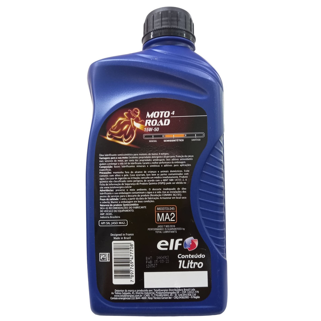Óleo de motor ELF MOTO 4 ROAD 15W-50 Código do produto: 223990 ANP: 20385 é um lubrificante recomendado para todos os tipos de motores de motocicletas 4 tempos de alta performance. Perfeitamente compatível para utilização em sistemas catalíticos em motores 4 tempos e com utilização de combustíveis sem chumbo. Este lubrificante atende os mais severos requisitos de performance para uso urbano e longa distância. Especificações Internacionais - API SN - JASO MA2