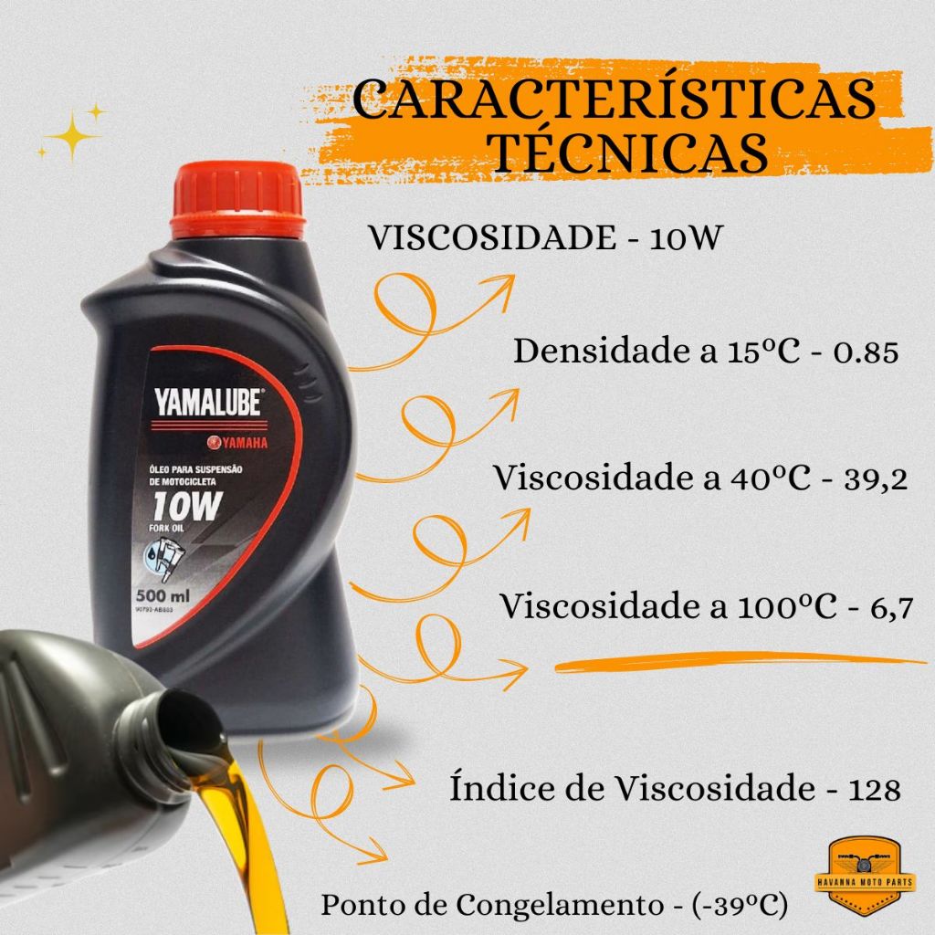 YAMALUBE ÓLEO PARA SUSPENÇÃO - ORIGINAL YAMAHA Fluído hidráulico para suspensões telescópicas de motocicletas com excelente viscosidade que proporciona ótimo amortecimento em qualquer condição de uso e em diferentes modos de pilotagem. Conteúdo da Embalagem: 01 Óleo de Suspenção Yamalube 500ml Código Original do Produto: 90793AB80300 Benefícios: - Desempenho garantido pela Yamaha Motor Co. Ltd.; - Yamalube Fork Oil 10W é constituído por bases minerais reforçadas por aditivos específicos, com um alto poder antidesgaste e boa fluidez a baixas temperaturas; - Possibilita um ótimo amortecimento em qualquer clima e estável ao longo do tempo; Especificações: - Base mineral; - SAE 10W; - VISCOSIDADE - 10W - Densidade a 15ºC - 0.85 - Viscosidade a 40ºC - 39,2 - Viscosidade a 100ºC - 6,7 - Índice de Viscosidade - 128 - Ponto de Congelamento - (-39ºC) Importante !! As Peças Genuinas Yamaha preservam características originais da motocicleta, garantindo desta forma o seu perfeito funcionamento e segurança. Ao utiliza-las, você garante que sua motocicleta se mantenha da mesma maneira em que saiu da fábrica.