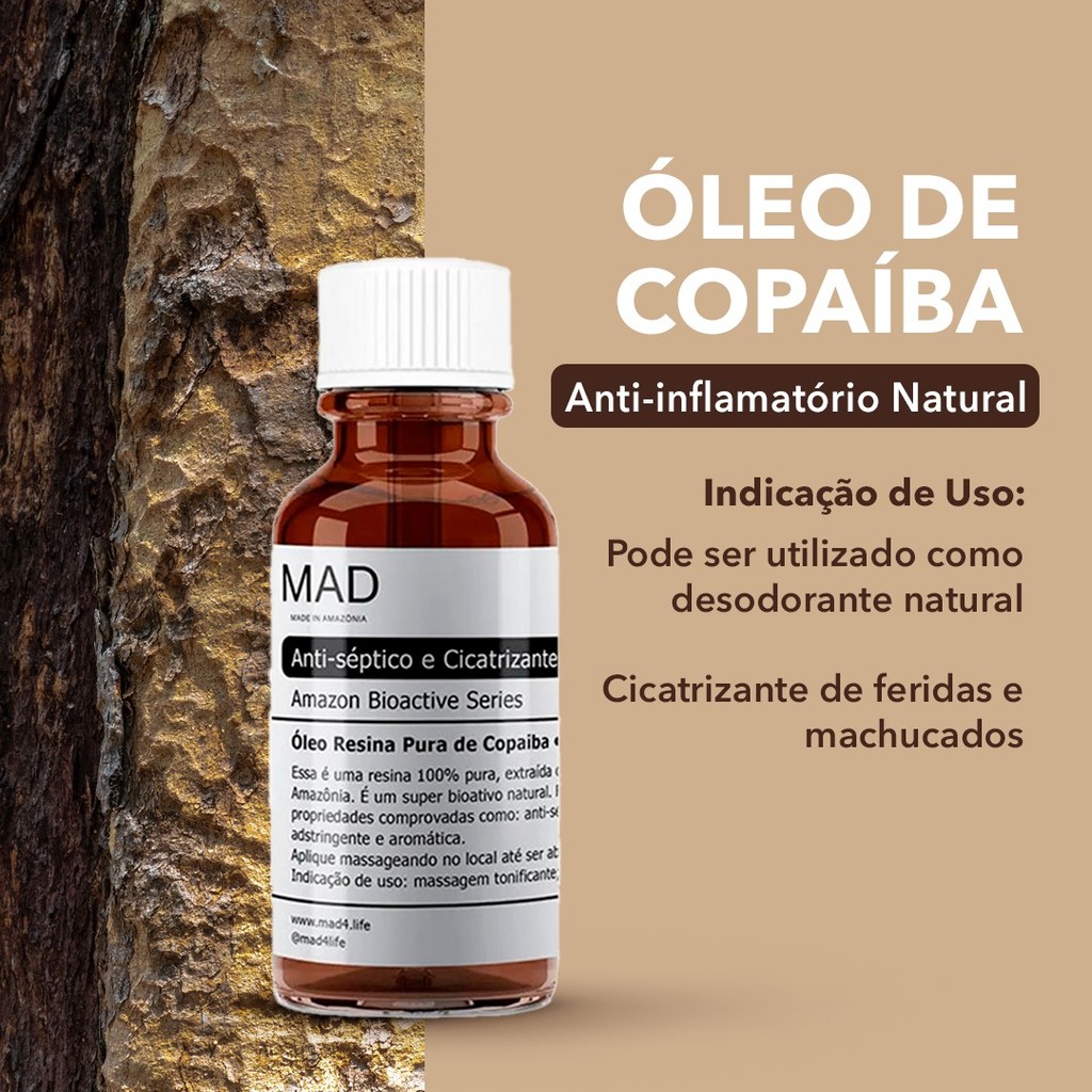 Óleo de Copaíba: Anti-inflamatório Natural O óleo de copaíba é uma resina natural conhecida por atuar em 8 sistemas do corpo humano. Utilizado na Amazônia por nossos ancestrais há mais de 1000 anos, ele é valorizado por suas propriedades anti-inflamatórias, analgésicas e cicatrizantes. Modo de Uso: Uso externo sobre a pele: Aplique o óleo de copaíba diretamente sobre áreas afetadas, beneficiando-se de sua função reparadora e anti-inflamatória. Indicações de uso: ✓ Pode ser utilizado como desodorante natural ✓ Cicatrizante de feridas e machucados
