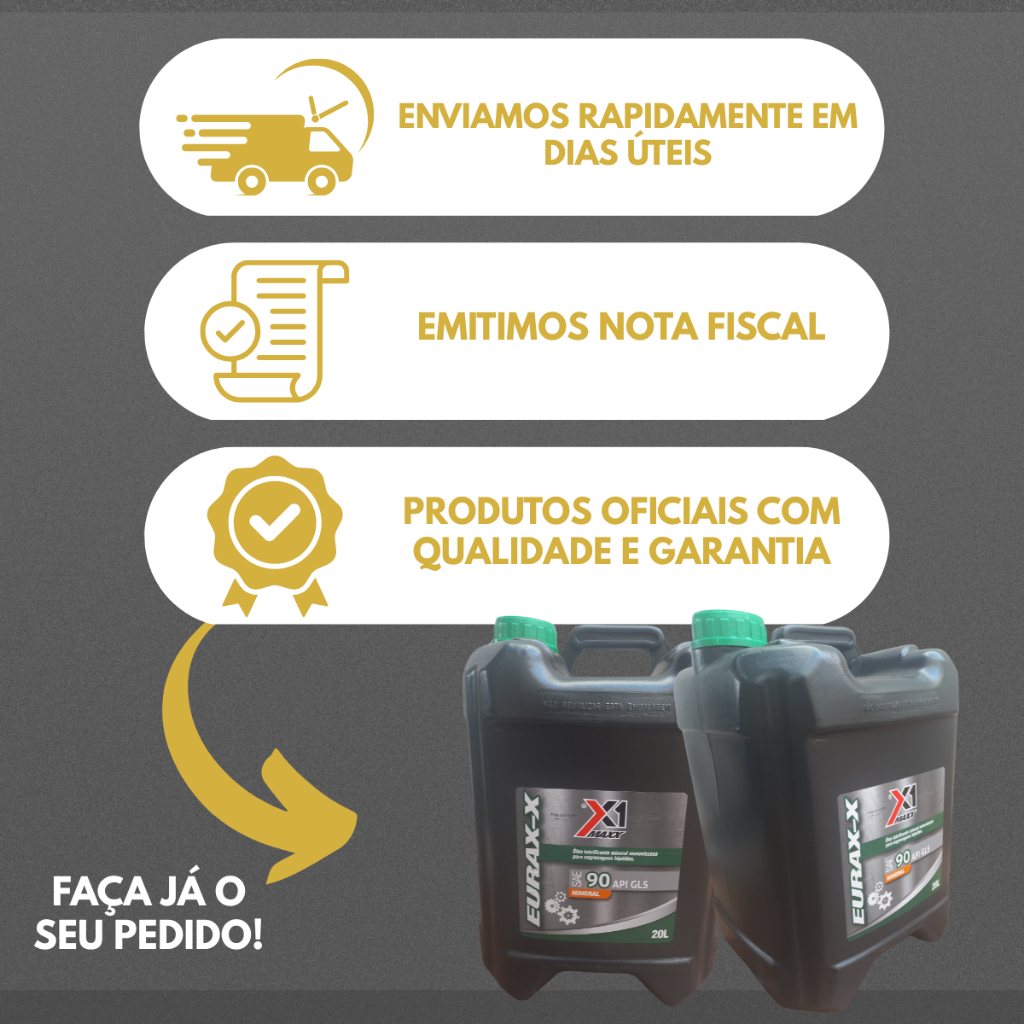 *** ATENÇÃO ANTES DE FINALIZAR A COMPRA *** COMPRAR APENAS 1 GALÃO POR PEDIDO, OS PEDIDOS DE MAIS GALÕES SERÃO CANCELADOS AUTOMATICAMENTE PELA PLATAFORMA Estamos há mais de 20 anos no mercado de lubrificantes buscando sempre a satisfação dos nossos clientes. Trabalhamos com as melhores marcas do ramo automotivo e aqui você encontrará as melhores produtos para seu veículo, e contará com qualidade e o melhor atendimento. Nossos produtos são todos rigorosamente conferidos e embalados para que chegue até você da melhor maneira. ÓLEO SAE 90 API GL5 EURAX X1 Recomendado para uso em caixas de engrenagens hipóides de eixos traseiros, caixas de mudança e caixas de engrenagens hipóides em geral. O Óleo Lubrificante X1 90 é um óleo multiviscosidade projetado para motores a diesel, oferecendo proteção contra o desgaste, corrosão e oxidação, garantindo o desempenho e a durabilidade do motor. Além disso, possui propriedades que ajudam a reduzir a fricção e o atrito, melhorando a eficiência energética e prolongando a vida útil dos componentes. Com sua fórmula avançada, o Óleo Lubrificante X1 90 é capaz de: - Reduzir o desgaste e o consumo de combustível - Melhorar a eficiência energética e reduzir as emissões - Proteger contra a corrosão e a oxidação - Prolongar a vida útil dos componentes e reduzir os custos de manutenção - Oferecer uma lubrificação eficaz em uma ampla faixa de temperaturas É ideal para uso em motores diesel modernos, onde a lubrificação é crítica para o funcionamento correto do veículo. Além disso, é compatível com uma variedade de materiais e superfícies, tornando-o uma escolha versátil para diversas aplicações. O Óleo Lubrificante Eurax 90 GL-5 20 Litros é desenvolvido com tecnologia de ponta para garantir proteção superior e desempenho confiável em transmissões manuais, caixas de engrenagens e diferenciais que operam sob condições moderadas de carga e velocidade. Com classificação API G5-4, este lubrificante oferece excelente resistência ao desgaste, à oxidação e à formação de depósitos, prolongando a vida útil dos componentes mecânicos. Formulado com óleos básicos altamente refinados e aditivos de extrema pressão, o Eurax 90 GL-5 proporciona trocas suaves de marcha, redução de ruído e vibração, além de manter a estabilidade térmica em operações contínuas e exigentes. ---- Principais Aplicações Transmissões manuais Diferenciais hipoides com cargas moderadas Caixas de câmbio de veículos leves e pesados Equipamentos agrícolas e fora de estrada Características e Benefícios Proteção contra desgaste, corrosão e oxidação Estabilidade térmica e resistência ao cisalhamento Lubrificação eficiente em altas e baixas temperaturas Excelente desempenho em sistemas com engrenagens helicoidais e hipoides ---- Recomendações de uso Compatível com veículos e equipamentos que exijam óleo SAE 90 GL-5, como caminhões, ônibus, tratores, colheitadeiras, máquinas industriais e utilitários de diversas marcas: Volkswagen Caminhões Mercedes-Benz Ford Cargo Massey Ferguson Valtra John Deere Iveco New Holland, entre outros. --- Dúvidas frequentes: ---- Como saber se esse óleo serve para o meu veículo? R: Nós recomendamos que veja o manual do fabricante para saber se o óleo é utilizado no seu veículo, acima na descrição consta também as especificações de veículos que podem ser compatíveis com o óleo 90 GL - 5 SAE, mas caso tenha qualquer dúvida entre em contato conosco através do chat ---- O produto é original? R: Sim o nosso produto é original e tem garantia do fabricante ---- Vocês enviam pro Brasil todo? Qual o prazo de entrega e o frete? R: Sim, nós enviamos para todo o Brasil. Para verificar o prazo de entrega e o frete basta inserir o seu CEP no campo ao lado ou abaixo das fotos ou se tiver dúvidas entre em contato com a gente nos enviando uma mensagem! ---- O produto tem garantia? R: Sim, nós oferecemos ao nosso produto uma garantia de 30 dias para qualquer intercorrência que você tenha com o produto ---- Vocês emitem Nota Fiscal? R: Sim, nós emitimos a nota fiscal no ato da compra na plataforma e ela chega no e-mail de compra cadastrado, se precisar de mais detalhes é só nos encaminhar uma mensagem que acompanharemos sua solicitação! ---- Porque não vem lacre interno? R: Vou te explicar sobre esse galão de 20L para que entenda melhor, a maioria das marcas de óleos no galão de 20L trabalham apenas com o lacre de rosca porque ele é sob pressão e quando aplicado não apresenta vazamentos durante o transporte, então a tampa do galão é rosqueada diferente de tampas em embalagens de 1L que são de outro modelo, por isso elas são pressurizadas com lacre interno. Todos os nossos galões de 20L sempre chegaram com esse lacre de rosca e a pressão deles é conferida e redobrada pelo setor de embalagens antes do envio para assegurar que não haverá vazamentos durante o transporte. Ficou alguma dúvida até o momento? Caso possa esclarecer mais algum detalhe é só me chamar por aqui que estaremos aqui!