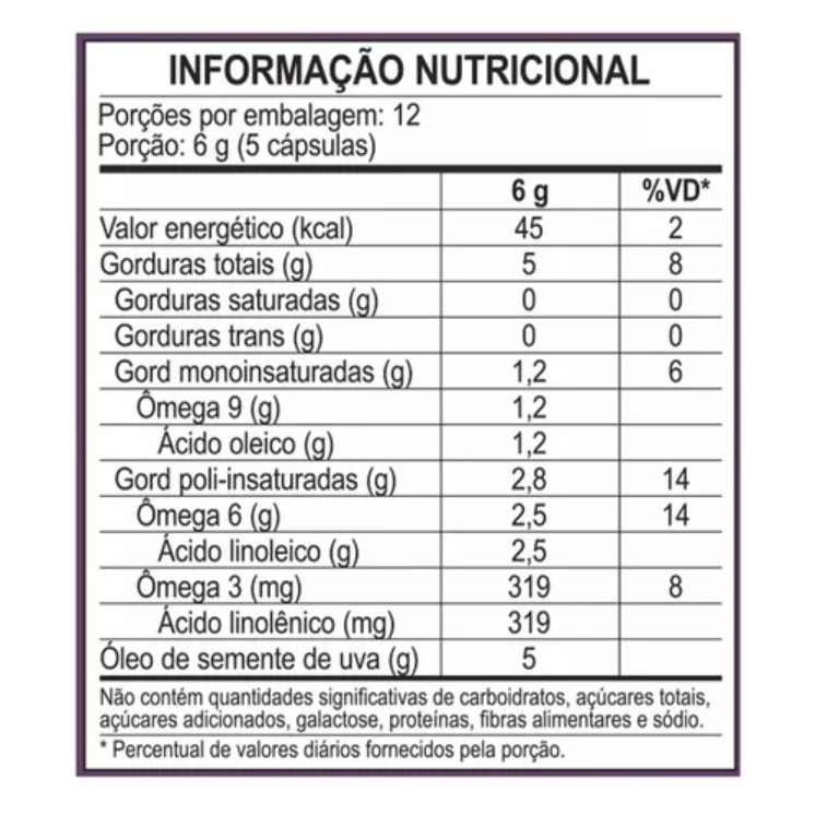 NOVA FÓRMULA, NOVA EMBALAGEM. Oleo de Semente de Uva 60 Capsulas 1000mg - Unilife O Oleo da Semente de Uva traz diversos beneficios a nossa saude. Por ser fonte de Acido Linoleico (Omega 6), resveratrol e Vitamina E, atua como um excelente antioxidante. Tambem atua na pele, nas veias (prevenindo trombose, varizes e varicozes), alem de auxiliar em tratamentos de doencas cardiacas, colesterol e doencas neurais. Beneficios Oleo de Semente de Uva: 1. Fonte de acidos graxos essenciais. 3. Auxilia no controle do colesterol. 4. Estimula a cicatrizacao de ferimentos, alem de melhorar o aspecto da pele. 5. Reduz o risco de doencas degenerativas (neurais). 7. Ativa a circulacao.