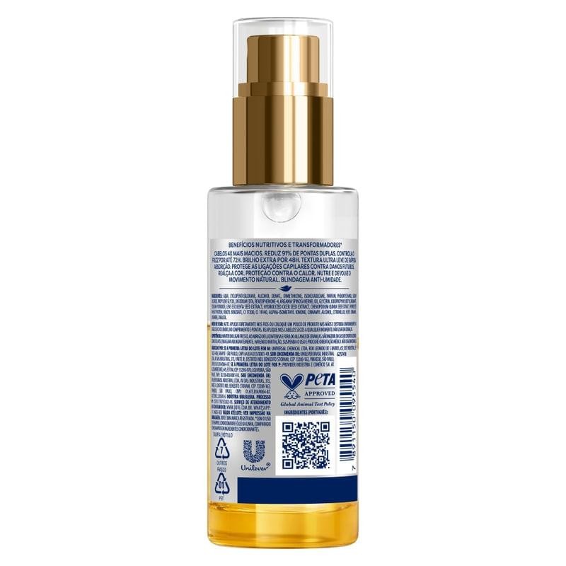 Óleo + Sérum Bifásico Dove Bond Intense Repair 110 ml – Reparação Capilar Profunda com Brilho e Maciez O Óleo + Sérum Bifásico Dove Bond Intense Repair possui a tecnologia patenteada Bio-Protein Care, proteína 100% compatível com a estrutura natural do cabelo, que age em harmonia com a biologia capilar e reverte os sinais do dano. Contém, 7% Peptídeo Complex, que são microcomponentes da proteína que conseguem atingir as camadas mais internas da fibra para restaurar as ligações rompidas a nível molecular. Juntos, proporcionam uma selagem nutritiva e um brilho extra aos cabelos. A sua fórmula bifásica (água + óleo) é infusionada com micromoléculas de óleos, que garantem hidratação e nutrição profundas, realçando a saúde do cabelo danificado. O óleo finalizador Dove Bond Intense Repair oferece 10 benefícios transformadores: 1. cabelos 4x mais macios; 2. controla o frizz por 72 horas; 3. brilho extremo por 48 horas; 4. blindagem anti-umidade; 5. proteção contra o calor; 6. nutre e devolve o movimento natural; 7. reduz 91% de pontas duplas; 8. protege as ligações capilares contra danos futuros; 9. realça a cor; 10. possui uma textura ultraleve de rápida absorção. Este produto está indicado para todos os tipos de cabelo. Para melhores resultados, experimente também outros produtos de cabelo Dove Bond Intense Repair. A Linha Dove Bond Intense Repair, com sua tecnologia patenteada, apresenta o melhor da ciência de Dove para o cabelo danificado ao reparar o cabelo a nível molecular, deixando os fios mais fortes, mais macios e com brilho extra. Globalmente, Dove não testa seus produtos em animais. Com o uso do Shampoo, Condicionador e Óleo da linha, comparado com Shampoo sem agentes condicionantes. Benefícios • O Óleo + Sérum Bifásico Dove Bond Intense Repair, nutre e realça a saúde dos fios • Possui a tecnologia patenteada Bio-Protein Care com 7% Peptídeo Complex, que deixa os cabelos 4x mais macios, e proporcionando um brilho extra aos cabelos por 48h • Este óleo finalizador garante uma blindagem anti-umidade aos fios controlando o frizz por até 72 horas, e reduzindo 91% de pontas duplas • O óleo de cabelo Dove Bond Intense Repair deixa os cabelos 4x mais macios com um brilho extra por 48 horas, deixando os fios nutridos e com movimento natural • Sua textura ultra leve de rápida absorção protege contra o calor, realça a cor e protege as ligações capilares contra danos futuros • Toda a linha Dove Bond Intense Repair, possui tecnologia patenteada que repara o cabelo a nível molecular, deixando os fios mais fortes, macios e com brilho extra por 48h Como Usar o Óleo + Sérum Dove Bond Intense Repair Corretamente? -Agite bem antes de usar, até que as duas fases estejam completamente misturadas. -Aplique uma pequena quantidade na palma das mãos. -Distribua uniformemente nos cabelos úmidos ou secos, do comprimento às pontas. -Não enxágue. -Finalize como desejar. Pode ser usado antes da escova ou para finalização. Dica Extra: Use após o shampoo e condicionador da linha Dove Bond Intense Repair para melhores resultados de reconstrução capilar. Curiosidades sobre o Produto -Inspirado em tratamentos de salão que reconstroem as ligações internas do cabelo. -Pode ser usado como pré-escova ou como finalizador. -A embalagem de 110 ml rende várias aplicações e tem ótimo custo-benefício. -Indicado também para cabelos quimicamente tratados. Sugestão de Rotina de Hidratação Capilar com Produtos Dove passo 1:Limpeza Suave - Shampoo Dove Ritual de Reparação Passo 2:Hidratação Profunda - Máscara de Tratamento Dove 1 Minuto Fator de 50+ Passo 3:Hidratante - Condicionador Dove Hidratação Milagrosa Passo 4:Finalização - Sua preferencia com os produtos Dove Conheça o Óleo + Sérum Dove Bond Intense Repair 110 ml para quem busca restaurar a saúde dos fios com praticidade e resultado profissional. Sua fórmula bifásica de alta performance trata profundamente enquanto proporciona um acabamento sedoso, sem pesar. Seja como tratamento diário ou finalizador, ele é essencial na rotina de cuidados com cabelos danificados, promovendo força, brilho e beleza em cada fio.