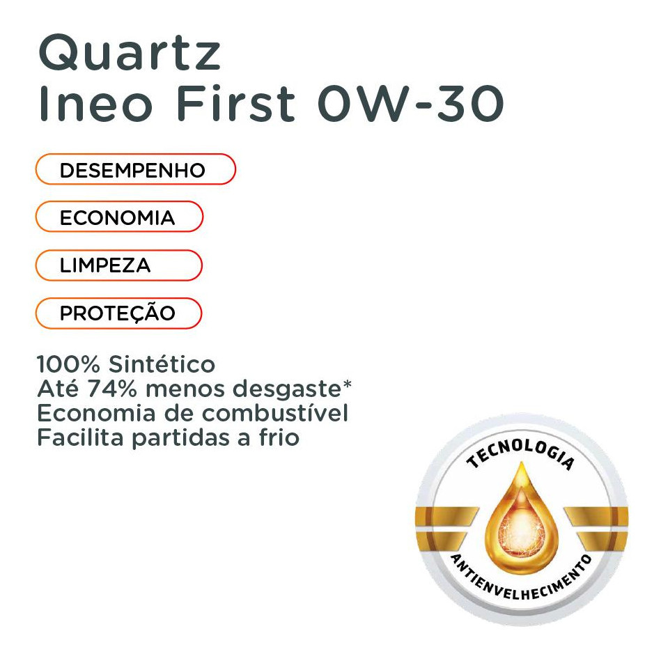 Óleo sintético que foi desenvolvido para atender requerimentos de motores gasolina, etanol, flexe GNV e diesel leve com DPF. Para condições de condução mais exigentes: direção esportiva, frequentes partidas, direção na cidade e rodovia. Desenvolvido com formulação Low SAPS e propriedades de economia de combustível. Normas Internacionais: - ACEA C1 Aprovação Fabricantes - PSA B71 2312 / 2302 - Jaguar Land Rover STJLR.03.5007 - Adequado para Toyota Características - Formulado com "Tecnologia Anti-Envelhecimento" até 74% menos desgaste comparado ao padrão do mercado* - Excelente proteção e limpeza do motor - Facilita a partida a frio mesmo em temperaturas muito baixas - Prolonga os intervalos de troca de óleo O óleo de carro TotalEnergies QUARTZ INEO FIRST 0W30 é utilizado pela PSA PEUGEOT CITROËN como óleo para motor de primeiro enchimento e é recomendado pela PEUGEOT, CITROËN e DS no pós-venda. Particularmente adequado para uso com motores recentes da PSA, particularmente os equipados com e-HDI utilizando tecnologias Stop & Start, e motores híbridos que requerem óleos de motor de nova geração. Os sistemas de pós-tratamento, sensíveis aos lubrificantes utilizados e dispendiosos de manter, estão também protegidos a longo prazo graças à formulação "Low SAPS" (baixo teor de cinzas sulfatadas, teor de fósforo e enxofre). Tecnologia Antienvelhecimento A nova geração de óleo para completa proteção do motor. A Tecnologia Antienvelhecimento (AGE RESISTANCE TECHNOLOGY) proporciona proteção especializada, para combater os desafios diários a longo prazo. Oferece uma proteção imbatível do motor. A sua combinação única de moléculas hiperativas cria uma forte película de óleo espessa em todas as peças do motor envolvidas. Os motores estão absolutamente protegidos contra uma variedade de desafios, desde o desgaste até à oxidação do óleo, mesmo em temperaturas extremas *ACEA - OM646LA (cam wear) Benefícios - Redução do impacto ambiental: Economia de combustível de 3,33% medida pelo teste oficial ACEA M111 FE e economia acima de 4,2% medida durante o ciclo NEDC em comparação com o óleo de grau 5W-40 em conformidade com o teste oficial ACEA utilizado para medir as emissões de CO2. Garante o cumprimento de todos os níveis de desempenho exigidos pela PEUGEOT, CITROËN e DS em relação às normas ambientais. - Proteção dos sistemas de controle da poluição: Este lubrificante também otimiza a forma como funcionam os catalisadores de três vias e os filtros de partículas, evitando que fiquem entupidos com fuligem ou depósitos de borra, o que reduz as emissões de partículas, NOx, HC e CO em particular. - Proteção e limpeza do motor: Este óleo oferece a melhor proteção possível na sua categoria contra o desgaste e o entupimento assim que é dada a partida ao motor. - Personalizado: desenvolvido especialmente para motores da família THP (Turbo High Pressure), utilizados em determinados modelos da PSA, BMW, Mini - Partidas a frio mais fáceis: A classe 0w30, juntamente com aditivos especiais, facilita as partidas a frio do motor, mesmo a temperaturas muito baixas (testes de validação realizados até -40C). - Intervalos de troca de óleo: TotalEnergies QUARTZ INEO FIRST 0w30 mantém todas as suas propriedades, de acordo com os planos de serviço recomendados por PEUGEOT, CITROËN e DS. ANP: 17282