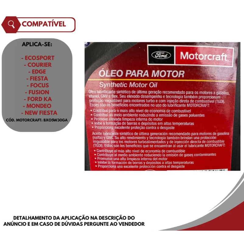 Conteúdo da embalagem: 01 litro 5w30 SINTÉTICO API SP SAE FORD Motorcraft **Selecione a Quantidade na Variação** **Acima de 3 Litros Acompanha Etiqueta para Marcar próxima troca de óleo** Óleo Sintético Motorcraft para Motor API SP SAE 5W30 é um lubrificante de última geração e alta performance, formulado com óleos básicos 100% sintéticos de altíssimo desempenho e aditivos de avançada tecnologia. APLICAÇÕES Todos os motores de quatro tempos flex, a gasolina e etanol de automóveis, SUVs e picapes, além de outros veículos ou equipamentos operando em quaisquer condições de serviço que requeiram um produto que atenda à especificação abaixo. • Categorias de serviço: o API SP ou anteriores BENEFÍCIOS • Economia de combustível otimizada • Proteção excepcional para motores turbo e com injeção direta de combustível. • Proteção contra o efeito de pré-ignição em baixa velocidade (LSPI) em motores turbo com injeção direta (GTDI) • Excelente proteção antidesgaste • Proteção contra a degradação por altas temperaturas • Excelente proteção contra a formação de depósitos, verniz e borras no motor • Redução dos teores de emissão de gases nocivos ao meio ambiente • Baixo consumo de óleo • Excelente partida a frio AutoStileMotors.