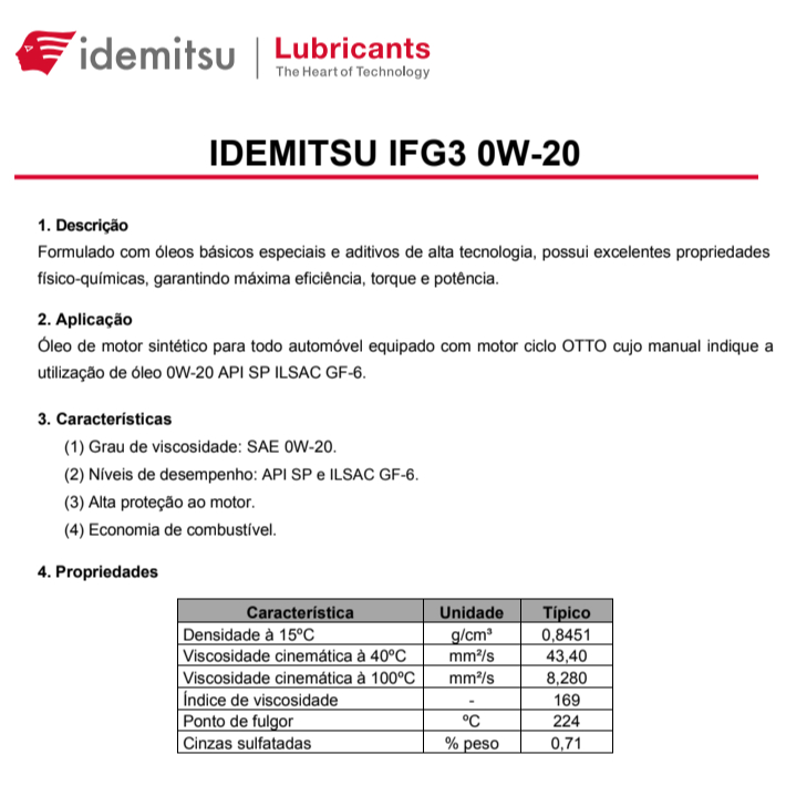 Conteúdo da embalagem: 01 litro 0w20 SINTÉTICO API SP SAE Idemitsu TECNOLOGIA JAPONESA **Produto Original Idemitsu l ** **Produtos à pronta entrega ** Aplicação: A Idemitsu é uma marca de lubrificantes que tem parceria com montadoras como Daihatsu, Toyota, Suzuki, Subaru, Nissan e Mitsubishi. A Idemitsu é uma marca premium com origem centenária e pioneira em tecnologia de lubrificantes. A parceria com montadoras renomadas resulta em óleos e fluidos que maximizam a eficiência e potência dos motores IDEMITSU IFG 3 0W-20 ATENDE AOS VEÍCULOS DAS MONTADORAS QUE INDIQUEM LUBRIFICANTE DE CLASSIFICAÇÃO SAE 0W-20, API SP / SL / SM / SN e/ou ILSAC GF-3 / GF-4 / GF-5 e GF-6. Desenvolvido de acordo com as rigorosas normas japonesas para atender as especificações exclusivas de montadoras. A melhor escolha Idemitsu 0W -20 é adequado para uso onde 0W -20 é recomendado: todos os projetos de motores montadoras asiáticas, motores TGDI (Motores Turbo Alimentados com Injeção Direta) e motores PFI (Normalmente Aspirados). Grau de Viscosidade: 0W-20 / API: SP / ILSAC GF-6 Autostilemotors.
