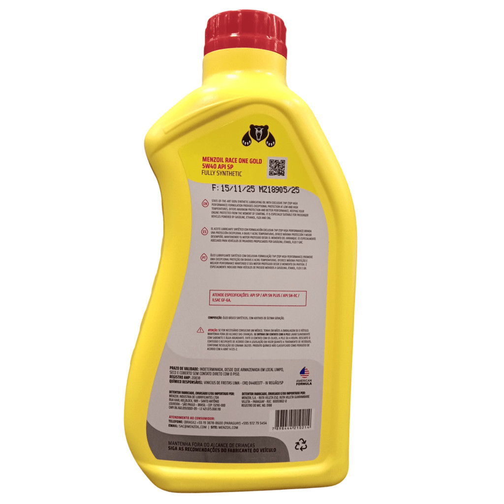Óleo Sintetico para Motor Race One Gold 5W40 - 1L Menzoil Código: 010103094 Desenvolvido para minimizar os danos causados pelo contato das peças. Especificacoes: Api Sp, Api Sn Plus, Api Sn-Rc, Ilsac Gf-6A Desenvolvido para minimizar os danos causados pelo contato das peças. Com a mais avançada tecnologia, o lubrificante 100% sintético alcana rapidamente todos os espaços do motor, reduz o nível de atrito e mantém a limpeza constante, Com o motor trabalhando sem esforço e com menos fricção interna, o resultado é economia de combustível e ótimo desempenho. Benefícios x Características: Ajuda a proteger os motores de alta performance da formação de depósitos que prejudicam o desempenho e a eficiência do motor. Ajuda a remover os depósitos de borra deixados por lubrificantes inferiores Baixo consumo de óleo.