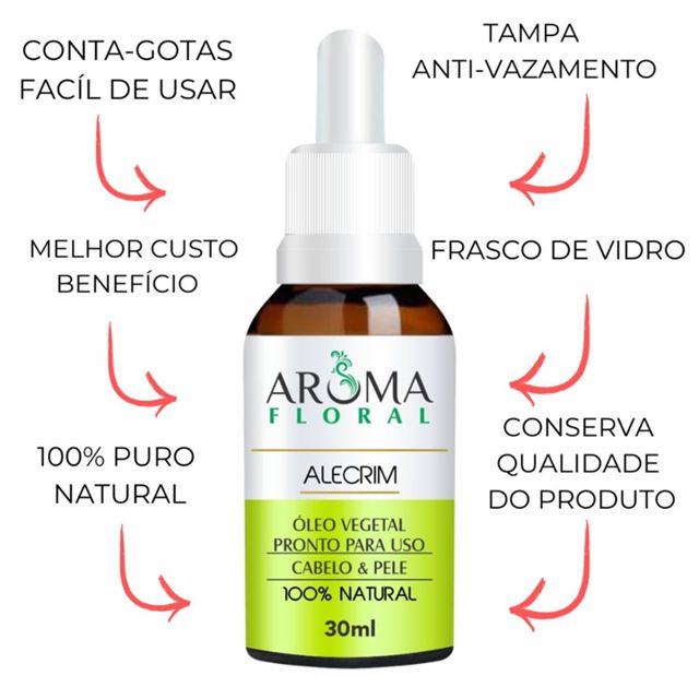 Receba seus Produtos Lacrados e Bem Embalados. BENEFÍCIOS DO ÓLEO DE ALECRIM Benefícios para os Cabelos: Combate a queda, Trata a caspa, Estimula o crescimento de fios novos, Dá brilho e elasticidade, Combate a oleosidade, Previne a calvície, Escurece os fios brancos, Realça a cor dos cabelos escuros. Benefícios para a Pele: Antisséptico e Antimicrobiano, Combate a celulite, Adstringente, Previne rugas, Combate a dermatite, Mantém o nível de colágeno, Ajuda na estrutura celular, Reduz a flacidez. ESCOLHA OS SEUS: * ÓLEO VEGETAL ALECRIM 30ML (VIDRO) ÓLEO VEGETAL ALECRIM 30ML (PET) * KIT 2 ÓLEO VEGETAL ALECRIM 30ML (VIDRO) * KIT 2 ÓLEO VEGETAL ALECRIM 30ML (PET) * ÓLEO VEGETAL ALECRIM 100ML APLICAÇÃO E SUGESTÃO DE USO Pode ser aplicado diretamente na pele como bálsamo para massagem corporal ou relaxante, ser aplicado diretamente no cabelo e condicionador, hidratantes corporal, fabricação de cosméticos artesanais.