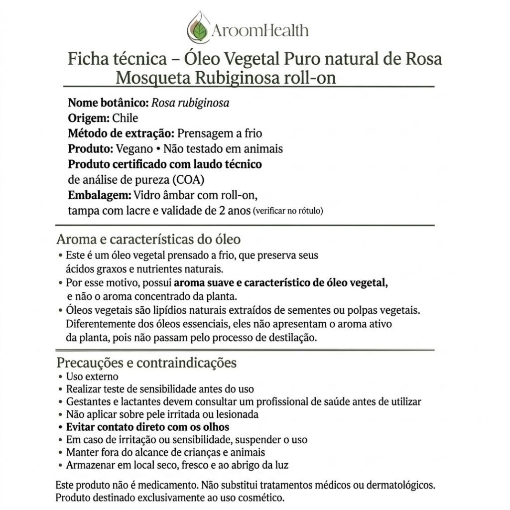Óleo vegetal puro natural de Rosa Mosqueta Rubiginosa roll-on - 20ml AroomHealth Nome botânico: Rosa rubiginosa Origem: Chile Extração: Prensagem a frio Produto vegano – Não testado em animais Vidro âmbar em roll-on , 01( uma) unidade . Validade de 2 anos (verifique no rótulo). Óleos vegetais são gorduras extraídas das plantas, desodorizado e seu aroma é semelhando a de um óleo comum. O óleo de Rosa mosqueta (Rosa rubiginosa) é um potente aliado para cuidados com o rosto e a região das olheiras, graças à sua riqueza em ácidos graxos essenciais, vitamina A natural (retinol) e antioxidantes, que ajudam na regeneração e uniformização da pele. Benefícios para o rosto Estimula a renovação celular, suavizando linhas de expressão e rugas Clareia manchas, incluindo marcas de acne e melasma leve Melhora a elasticidade e firmeza da pele Proporciona hidratação profunda e brilho natural Previne sinais de envelhecimento precoce Benefícios para as olheiras Clareia olheiras escuras causadas por hiperpigmentação Hidrata e suaviza a pele fina ao redor dos olhos Auxilia na regeneração da pele, reduzindo sinais de cansaço Ajuda a uniformizar o tom e a textura da área dos olhos Como usar Limpe bem a pele antes da aplicação. Passe o roll-on diretamente no rosto, nas áreas desejadas — como manchas, linhas finas, marcas de acne ou regiões ressecadas. Na área das olheiras, deslize o roll-on suavemente, fazendo movimentos leves, sem pressionar. Massageie com a ponta dos dedos até absorver completamente, se necessário. Pode ser usado a noite e de dia . Durante o dia aplicar filtro solar. Uso diário PRECAUÇÕES • USO EXTERNO. • Faça sempre o teste de alergia antes do uso. • Gestantes e lactantes devem consultar um médico antes do uso. • Armazene em local seco e fresco, longe da luz e fora do alcance de crianças e animais. • Havendo sensibilidade ao produto, suspender o u