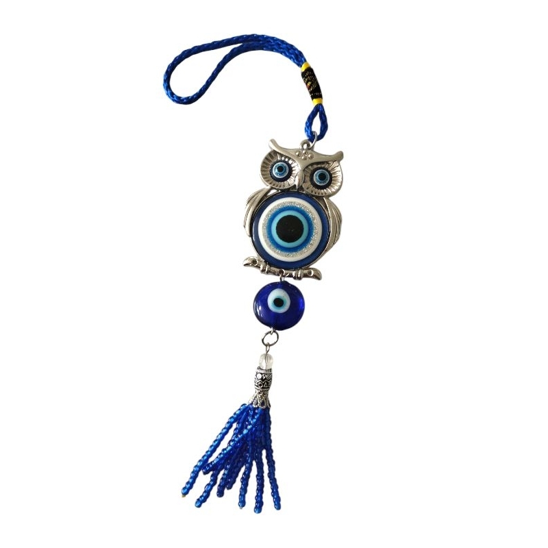 Amuleto de proteção com design de coruja e olho grego em Murano, símbolo contra o mau-olhado e inveja. Tem o poder de absorver as energias negativas. Atrai sorte e prosperidade. Feito em metal, Murano e com detalhes artesanais de pingente de miçangas, ideal para pendurar em portas, paredes, carro ou espelhos. Descrição: Feito em Metal e corda Tem aproximadamente 25cm Produto importado.
