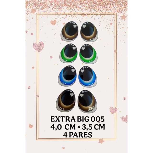 Olhos Adesivos Resinados – Feitos com Amor, Pensando em Cada Detalhe! Deixe suas criações ainda mais encantadoras com nossos olhos adesivos resinados, produzidos artesanalmente com vinil adesivo recortado e acabamento em resina epóxi flexível de alta qualidade! ✅Antes de comprar, por favor, leia toda a descrição com atenção. Cada olho é feito com uma modelagem própria, e os tamanhos variam conforme o formato – isso garante que você escolha a opção perfeita para o seu trabalho! ✅Tamanhos disponíveis (comprimento maior): Extra G (4,0 X 3,8 cm) – 4 pares --- ✅ Observações importantes: ➡Verifique as medidas antes de comprar, para garantir que o tamanho se encaixe no seu projeto. ➡Por ser um produto artesanal e impresso, pode ocorrer pequena variação de tom, mas a qualidade permanece impecável.