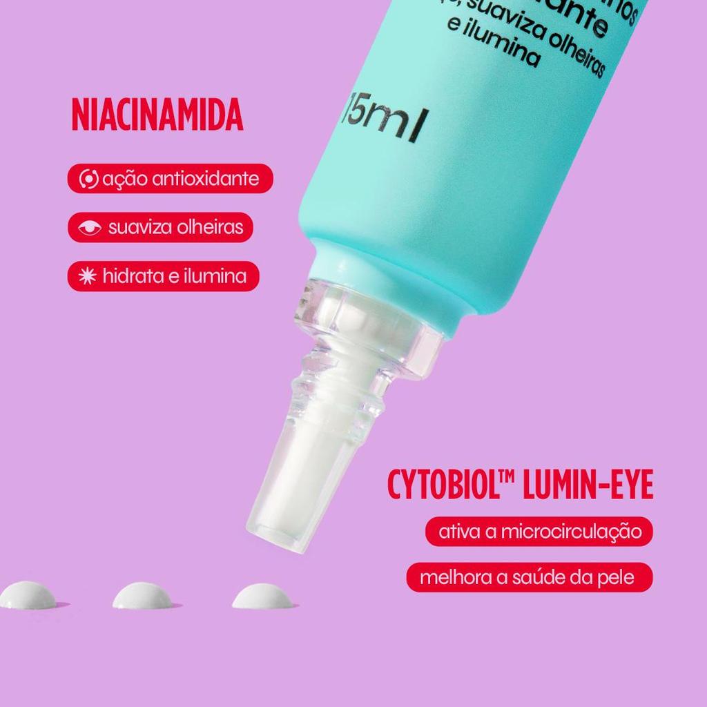 Esse é o FPS que faltava na sua rotina da manhã. O Creme para Olhos com proteção solar que suaviza as olheiras, reduz o inchaço e ilumina a pele na hora! Ele é o verdadeiro agente triplo: - Combate o aparecimento de novas linhas de expressão com a altíssima proteção solar do FPS 60eFPUVA 20. - Usa a Niacinamida e o Cytobiol Lumin-Eye para suavizar o inchaço e cuidar da pele da região dos olhos, melhorando a aparência das bolsas a cada uso. - Tem efeito iluminador instantâneo por causa do seu brilho suave. Para completar, ele ainda tem uma textura levinha de absorção rápida e um aplicador prático que vão descomplicar a sua rotina de skincare. O Creme para Olhos FPS 60 tem textura leve e confortável, que se adapta bem em todos os tipos de pele – até as mais sensíveis. Ele foi dermatologicamente e oftalmologicamente testado, e não arde os olhos. Como usar: Passo 1: Com a pele limpa e seca, faça pequenas bolinhas na região das olheiras. Passo 2: Use os dedos para espalhar o produto com uma leve pressão, fazendo uma massagem na área. Dica extra: Combine tratamento e make para dizer adeus para as olheiras. O Creme para Olhos pode ser usado junto com o Protetor Solar com Cor na sua rotina de todas as manhãs.