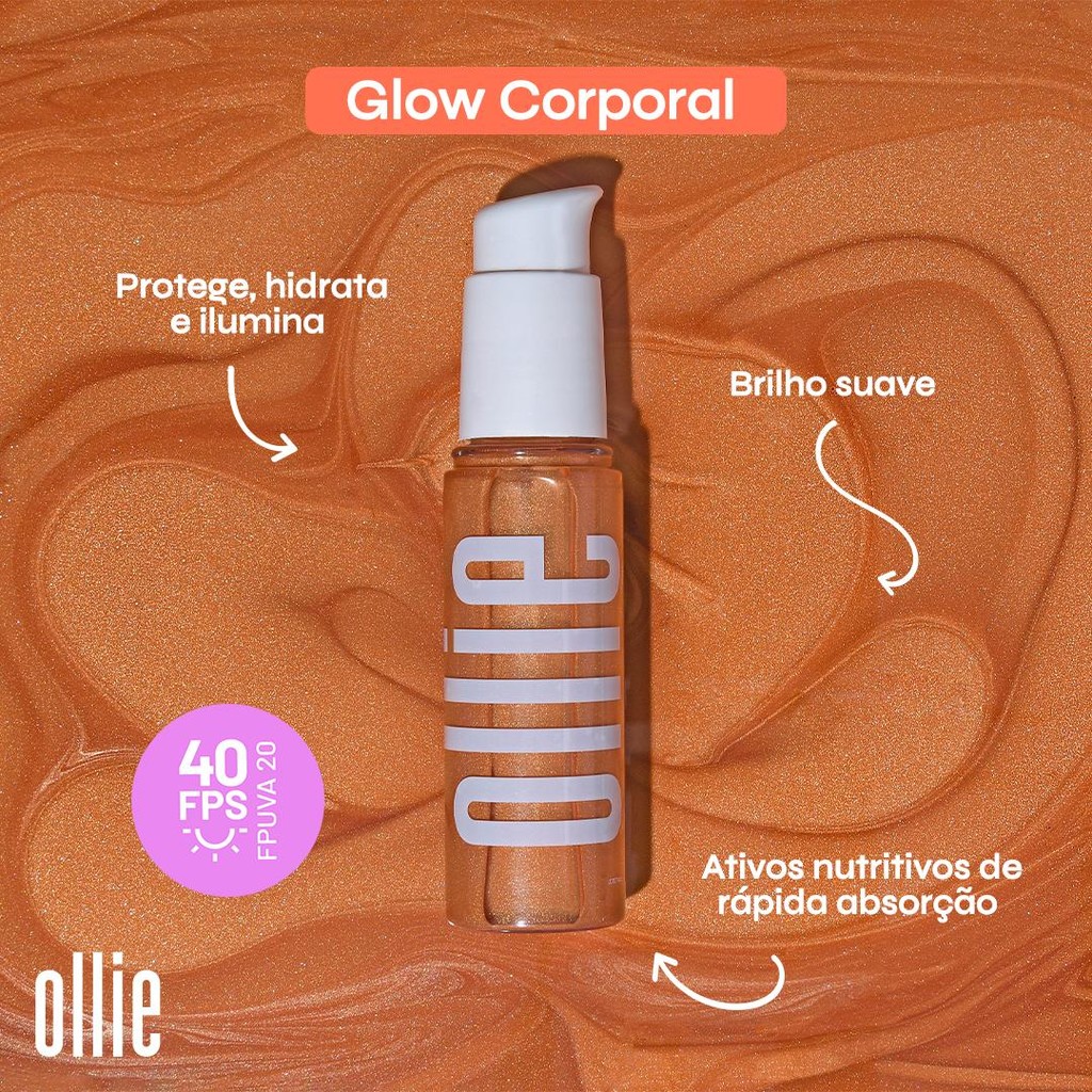 Nosso Glow Corporal é um óleo iluminador corporal, com FPS 40 e FPUVA 20 que além de proteger a pele dos raios solares, hidrata, deixando-a com aspecto saudável, iluminado e com viço. O óleo corporal Ollie tem ativos nutritivos de rápida absorção e um brilho suave que deixa a sua pele com cara de verão, o ano todo. Ele é a solução perfeita, e incrível, para proteger a pele diariamente, enquanto hidrata e ilumina. Vem conhecer! Os brilhos discretos do nosso Glow Corporal se adaptam a diferentes tonalidades, deixando a pele com um brilhinho discreto, perfeito para sua rotina. Produto dermatologicamente testado para oferecer proteção segura para todos os tipos de pele. Passo 1: com a pele limpa, agite bem o frasco antes de usar para distribuir o brilho. Passo 2: aplique uma pequena quantidade e espalhe uniformemente até alcançar o glow desejado. Passo 3: deixe secar completamente antes de vestir. O tempo pode variar conforme a umidade e a hidratação da pele. Pronto! Agora é só brilhar com a cara do verão!