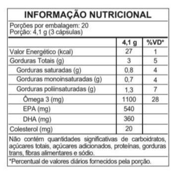 O suplemento de ômega-3 apoia a saúde cardiovascular, melhora a função cerebral e reduz a inflamação. Rico em EPA e DHA, também promove a saúde das articulações e da pele. INGREDIENTES Óleo de Peixe e Antioxidante: D – Alfa – Tocoferol. Cápsula: Gelificante gelatina, água purificada e umectante glicerina. ALÉRGICOS: CONTÉM PEIXE. PODE CONTER LEITE E SOJA. CONTÉM GLÚTEN. RECOMENDAÇÃO DE USO Consumir 3 (três) cápsulas ao dia, preferencialmente próximo às refeições ou conforme a orientação do médico e/ou nutricionista. O consumo deste produto deve ser acompanhado da ingestão de líquidos. INDICADO PARA O GRUPO POPULACIONAL MAIOR DE 19 ANOS. CUIDADOS DE CONSERVAÇÃO Conservar o produto em sua embalagem original, mantendo bem fechado em local seco e fresco, ao abrigo de luz, em temperatura ambiente (15 e 30oC). Após aberto, consumir em até 60 dias. ESTE PRODUTO NÃO É UM MEDICAMENTO. NÃO EXCEDER A RECOMENDAÇÃO DIÁRIA DE CONSUMO INDICADA NA EMBALAGEM. MANTENHA FORA DO ALCANCE DE CRIANÇAS. Produto isento da obrigatoriedade de registro, conforme Resolução RDC no240/2018. Envio rápido, em até 24h úteis após a confirmação de pagamento. Caso tenha ficado com alguma dúvida, mande para nós no chat e teremos o prazer em respondê-la. Agradecemos a sua visita e aguardamos a sua compra.