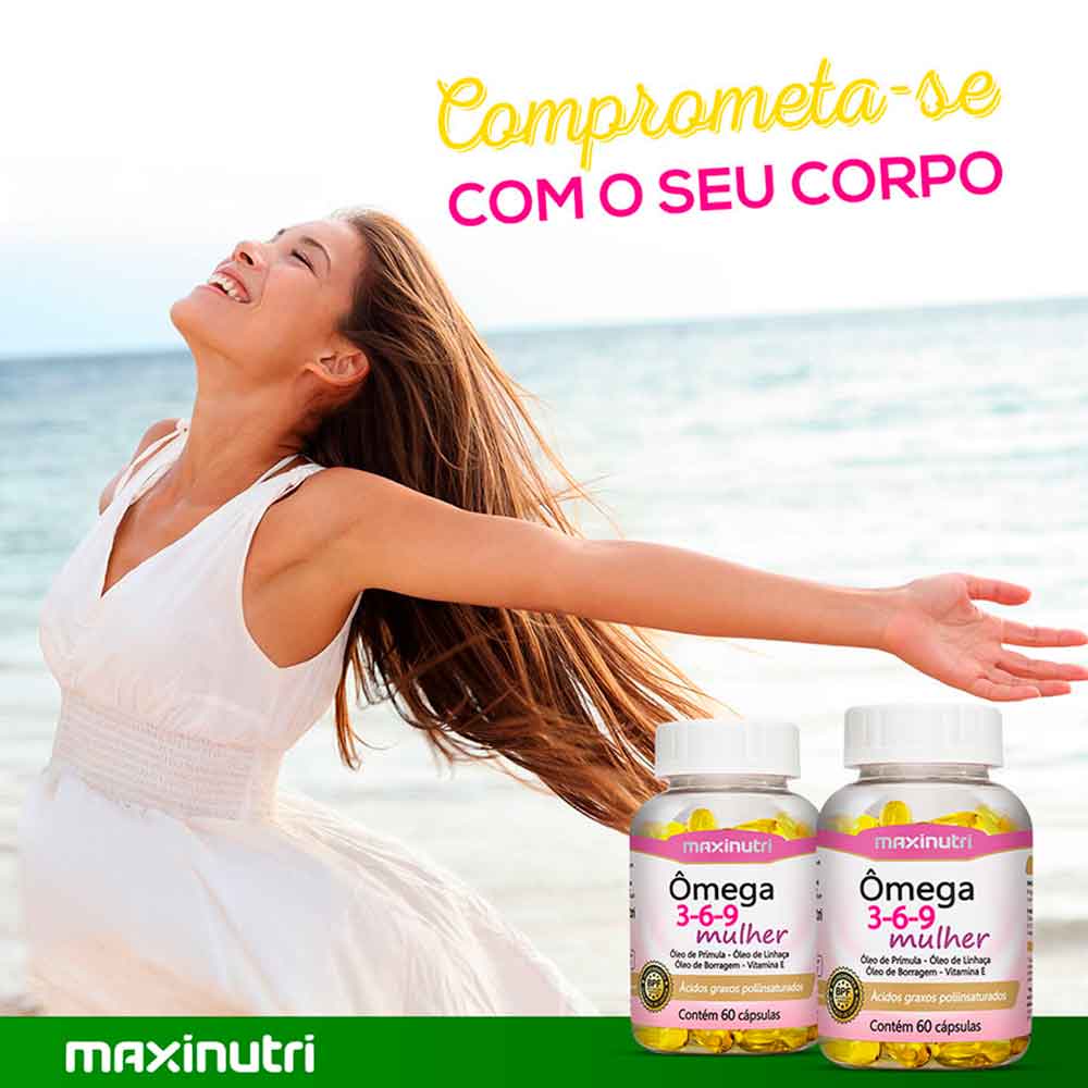 O Ômega 3, 6 e 9 Mulher Maxinutri conta com uma formulação visando ao bem-estar da mulher em todas as idades. Seus componentes podem auxiliar na redução de sintomas da TPM e menopausa. Eles atuam na regulação dos hormônios, redução de inchaços e dores mamárias, além de amenizar alterações de humor. Também, é capaz de atuar na manutenção do sistema circulatório e cardiovascular, além de possuir ação anti-inflamatória e antioxidante, reduzindo os danos dos radicais livres. Proporciona fortalecimento imunológico e promete normalizar os níveis de colesterol e triglicerídeos. Rico em vitamina E, auxilia no retardamento do envelhecimento precoce. Já o óleo de prímula é responsável pela hidratação, elasticidade e redução da perda de água da pele. Benefícios do Ômega 3: O ômega 3 regula a circulação sanguínea e o ritmo do coração, a fim de controlar a pressão arterial e os níveis de triglicerídeos no sangue. A ingestão age diminuindo a agregação plaquetária, o que impede a formação de coágulos que podem causar infartos ou aterosclerose. Graças ao EPA, apresenta ação antioxidante ao atuar no controle do processo inflamatório causado pela ingestão em excesso de ômega 6, gordura abundante em alimentos como óleos vegetais, linhaça, soja, entre outros. Já o DHA, tem relação com o funcionamento cerebral, cooperando com a melhoria da memória. A ação do ômega 3 ainda melhora o funcionamento do cérebro, combate a osteoporose, e evita doenças autoimunes. Conheça os tipos de Ômega (3, 6 e 9) Ômega 3: sua atuação no cérebro contribui para a manutenção das funções cognitivas e transmissão de impulsos nervosos. É considerado o mais importante entre os ômegas 3, 6 e 9; Ômega 6: atua na formação de membranas celulares, retina, síntese hormonal e funcionamento do sistema imunológico. Não é produzido pelo organismo, por isso deve ser consumido na alimentação e suplementação; Ômega 9: anti-inflamatório, previne doenças cardiovasculares, envelhecimento precoce e alguns tipos de câncer. É um ácido graxo facilmente metabolizado. Ingredientes: Óleo de linhaça, óleo de prímula, óleo de borragem e vitamina E, cápsula: gelatina, glicerina e água Sugestão de uso: Ingerir 2 cápsulas ao dia de preferência com as refeições. Advertência: Produto indicado para o Grupo Populacional igual ou maior de 19 anos.