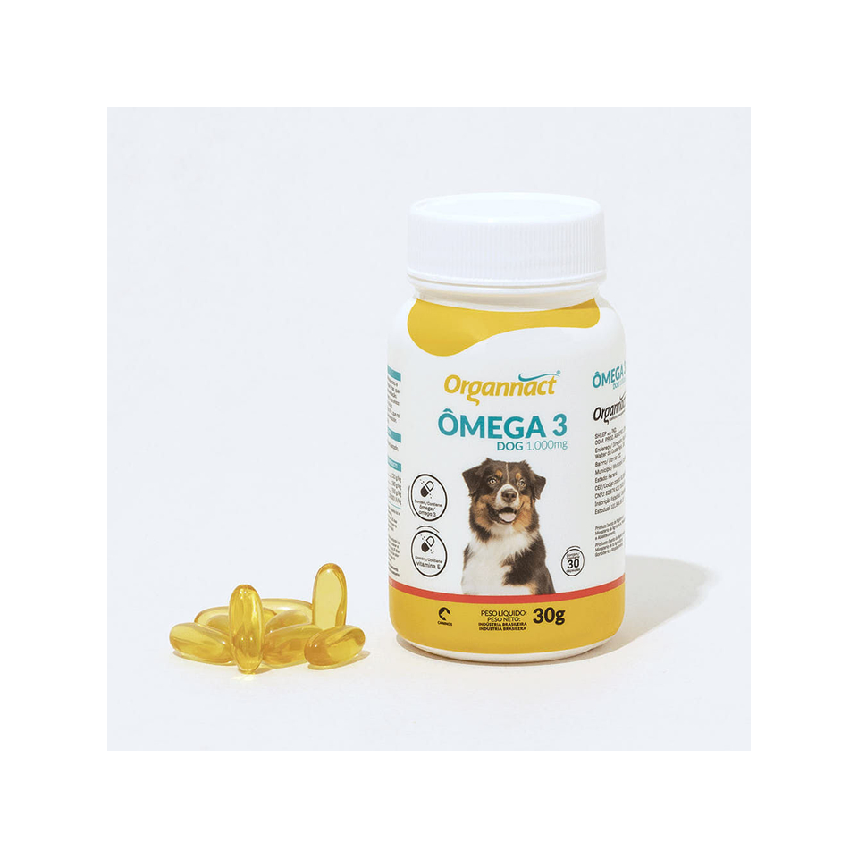 Omega 3 Dog 1000 Mg Suplemento Vitaminico - Organnact Validade: Julho ou Agosto de 2027 ÔMEGA 3 DOG é um suplemento alimentar, que contém Ômega 3, extraído do óleo de peixe de águas frias, ricos em DHA e EPA e vitamina E. Sua apresentação em cápsulas gelatinosas facilita a administração, pois não possui odor e sabor forte de peixe. O Ômega 3 é um ácido graxo essencial, que não pode ser sintetizado pelo organismo dos cães, dessa forma devem ser ingeridos através da dieta ou suplementação. Estudos comprovam que o uso do Ômega 3 na dieta de cães atuam na estrutura lipoprotéica das membranas celulares, como precursores dos eicosanóides. Indicação do produto: Suplemento vitamínico indicado para cães em qualquer idade ou fase da vida. Composição básica: Vitamina E, B.H.T. (hidróxido de tolueno butilado), óleo de peixe refinado. Modo de Usar: Fornecer diariamente por via oral: - Cápsulas 500 mg: 1 a 2 cápsulas por dia para cada 10 kg de peso do cão; - Cápsulas 1000 mg: 1 a 2 cápsulas por dia para cada 20 kg de peso do cão.