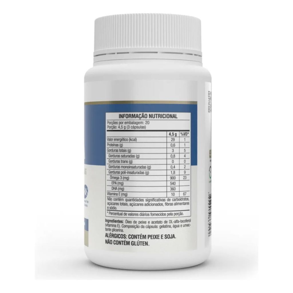 Ômega 3 EPA DHA 240 Cápsulas com Vitamina E – Alta Concentração Cuide da sua rotina de forma prática com o Ômega 3 EPA DHA, um suplemento de alta pureza e concentração, desenvolvido para quem busca qualidade no dia a dia. Com 540mg de EPA e 360mg de DHA por porção, é uma excelente fonte de ácidos graxos essenciais. Sua fórmula na forma TG (triglicerídeos) garante melhor absorção, além de ser enriquecida com vitamina E, que auxilia na proteção contra os radicais livres. Produto com certificação internacional IFOS™, garantindo pureza, frescor e livre de metais pesados. Destaques do Produto • 540mg de EPA + 360mg de DHA por porção • Fonte rica de ômega 3 de alta qualidade • Forma TG (melhor absorção) • Com vitamina E antioxidante • Certificação internacional IFOS™ • Livre de metais pesados • Cápsulas sem odor (Odor Free) • 240 cápsulas por embalagem Benefícios • Auxilia na complementação nutricional diária • Contribui para uma rotina mais equilibrada • Suplemento prático para o dia a dia Composição Óleo de peixe e acetato de DL-alfa-tocoferol (vitamina E) Cápsula: gelatina, água e glicerina Alérgicos Contém peixe e soja Não contém glúten Modo de Uso Ingerir 3 cápsulas ao dia ou conforme orientação profissional Informações Importantes • Produto original e de alta qualidade • Este produto não é um medicamento • Não exceder a recomendação diária • Manter fora do alcance de crianças