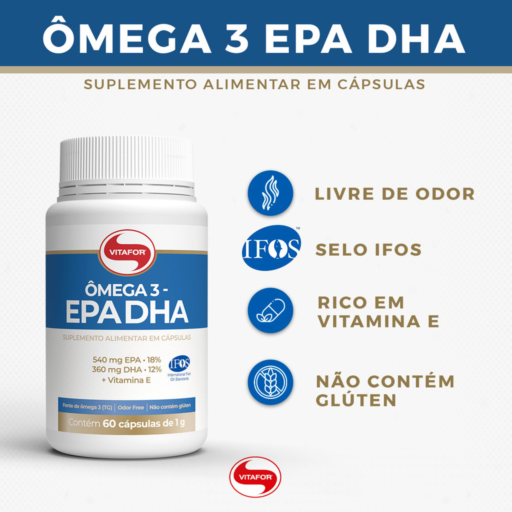 INFORMAÇÕES DE DESTAQUE - 540mg EPA - 360mg DHA - Certificação IFOS - Fonte de Omega 3tg - Odor Free - Contém Vitamina E. DESCRIÇÃO Cada Ômega 3 possui concentrações diferentes de EPA e DHA, mas é possível encontrar a concentração ideal para você! O Ômega 3 da Vitafor, é esse produto, a base de óleo de peixe, extraído de águas profundas, livre de metais pesados e rico em Vitamina E para auxiliar na proteção dos danos causados pelos radicais livres. O Ômega 3 EPA DHA da Vitafor foi pensado e desenvolvido para atender suas necessidades, com sua fórmula potencializada contendo 540 mg de EPA e 360 mg de DHA com tecnologia odor free e selo de qualidade. Não perca tempo, cuide da sua saúde com a linha Vitafor! INGREDIENTES Óleo de peixe e acetato de DL-alfa-tocoferol (vitamina E). Composição da cápsula: gelatina, água e umectante glicerina. NÃO CONTÉM GLÚTEN. ALÉRGICOS: Contém peixe e pode conter soja. SUGESTÃO DE USO Suplemento alimentar de uso adulto a partir de 19 anos de idade: ingerir 3,0g (3 cápsulas) ao dia ou seguir a recomendação de um profissional da saúde.