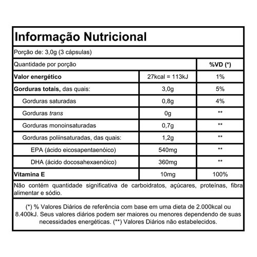 ÔMEGA 3 EPA DHA (120 CAPS) - VITAFOR Ômega 3 EPA DHA Vitafor é um suplemento a base de óleo de peixe extraído de águas frias e profundas das regiões polares, sendo rico em ácidos graxos de cadeia longa, da série ômega 3. Seus constituintes são: o ácido eicosapentaenóico (EPA) e o ácido docosahexaenóico (DHA), sendo considerados ácidos graxos essenciais. Também possui vitamina E em sua composição. A matéria-prima é livre de metais pesados, garantindo a pureza do óleo através da certificação IFOS (InternationalFishOil Standards). BENEFÍCIOS EPA : 540 mg / 18% DHA : 360 mg / 12% O EPA é importante por sua ação anti-inflamatória, pois atua na produção de substâncias anti-inflamatórias chamadas prostaglandinas E3. O EPA pode apresentar benefícios para a saúde cardiovascular e a circulação já que além de ser anti-inflamatório, também pode impedir que as plaquetas se unam formando trombos (coágulos) que podem causar trombose e derrame cerebral (AVC). Além disso, o EPA pode ser interessante para pessoas que apresentam sintomas ou doenças de caráter inflamatório, como celulite, obesidade e artrite reumatoide. O DHA é considerado um ótimo alimento para o cérebro e memória, já que grande parte do cérebro é composto por gorduras. Em relação aos benefícios, o DHA contém propriedade antioxidante e está envolvido com diversos processos cognitivos, além da correta sinalização entre os neurônios. Há estudos que afirmam que o DHA pode impedir a formação de substâncias deletérias para o cérebro e aumentar a produção de substâncias anti-inflamatórias e neuroprotetoras, tendo efeito protetor contra doenças neurodegenerativas como Alzheimer e Parkinson. manutenção de níveis saudáveis de triglicerídeos, desde que associado a uma alimentação equilibrada e hábitos de vida saudáveis. Ômega 3 rico em EPA e DHA; Com Vitamina E em sua composição. DIFERENCIAL DESSE PRODUTO Extraído de águas frias e profundas das regiões polares; Com certificação IFOS – InternationalFishOil Standards Program, que garante a isenção de metais pesados e pureza de matéria-prima. INGREDIENTES Óleo de peixe ( ômega 3), D-alfa Tocoferol Acetato ( Vitamina E ). Composição da cápsula: Gelatina, Água purificada e Umectante Glicerina . NÃO CONTÉM GLÚTEN. SUGESTÃO DE USO Ingerir 1 cápsula, 3 vezes ao dia, preferencialmente 30 minutos antes das principais refeições.