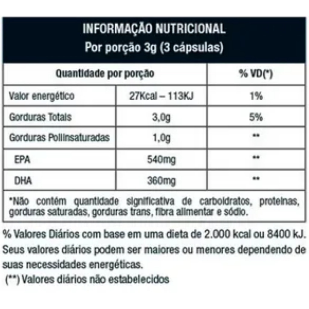 Ômega 3 – Suplemento Nutricional Descrição: - Suplemento de ômega 3 extraído de peixes de águas frias e profundas, com alta concentração de EPA (1110 mg) e DHA (720 mg) por dose. Desenvolvido para quem busca suplementação de qualidade com máxima absorção e praticidade. Diferenciais: - Alta concentração por dose - Certificação IFOS - Fórmula TG para melhor absorção e aproveitamento - Sem odor e com menor desconforto gástrico - Contém Vitamina E Sugestão de Uso: - Ingerir 1 cápsula, 3 vezes ao dia, ou conforme orientação de médico ou nutricionista. Alérgicos: - Contém peixe. Pode conter derivados de soja. Não contém glúten.