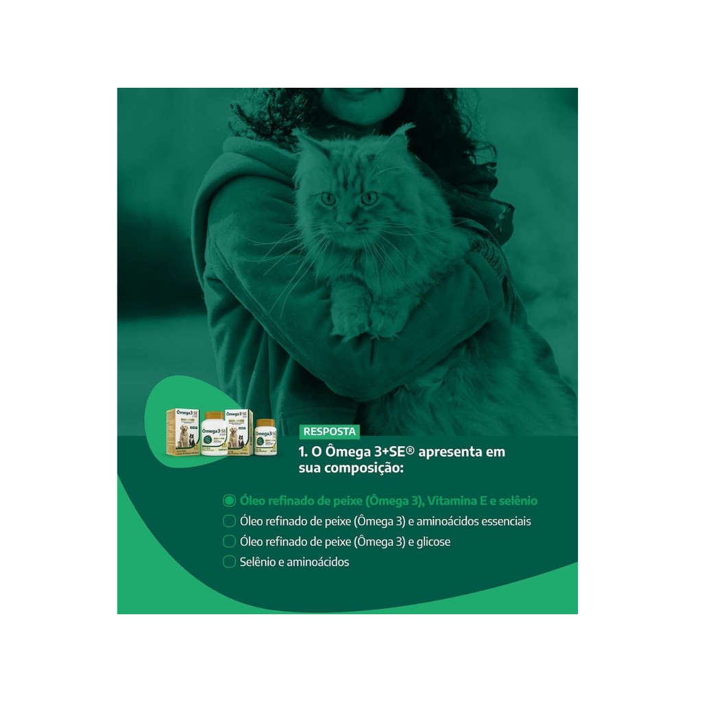 Validade: Julho/2026 Ômega 3+SE 550 Associação de ácidos graxos essenciais, Vitamina E e Selênio. Ômega 3+SE® 550 é um produto à base de ácidos graxos essenciais da família ômega 3. Obtido de peixes marinhos de águas frias, fornece EPA e DHA na proporção ideal (33:22), recomendada por especialistas. Além do ômega 3, possui em sua composição também vitamina E e o Selênio, conhecidos como potentes antioxidantes. A cápsula opaca, ajuda a preservar as características do produto, garantindo sua qualidade. DESTAQUES – Óleo de peixe; – Proporção EPA:DHA ideal (33:22); – Contém Selênio e Vitamina E; – Cápsula opaca: preserva melhor o produto. INDICAÇÃO Indicado para cães e gatos que necessitem da suplementação de ácidos graxos essenciais EPA e DHA. MODO DE USAR Ômega 3+SE® 550: Para ser usado por via oral. Administrar 1 cápsula ao dia para até 8 kg de peso corporal. As cápsulas poderão ser fornecidas diretamente na boca do animal, ou podem ser abertas e seu conteúdo administrado com auxílio de uma seringa ou misturado ao alimento. NÍVEIS DE GARANTIA ÔMEGA 3+SE® 550 POR kg DO PRODUTO POR CÁPSULA Ácido Docosahexaenóico (DHA) (Mín.)................110 g........121 mg Ácido Eicosapentaenóico (EPA) (Mín.)...............165 g........181,5 mg Ômega 3 (Mín.).....................................275 g........302,5 mg Selênio (Mín.).....................................54 mg........0,06 mg Vitamina E (Mín.)..................................45.454 UI....50 UI APRESENTAÇÃO Frascos contendo 30 cápsulas.