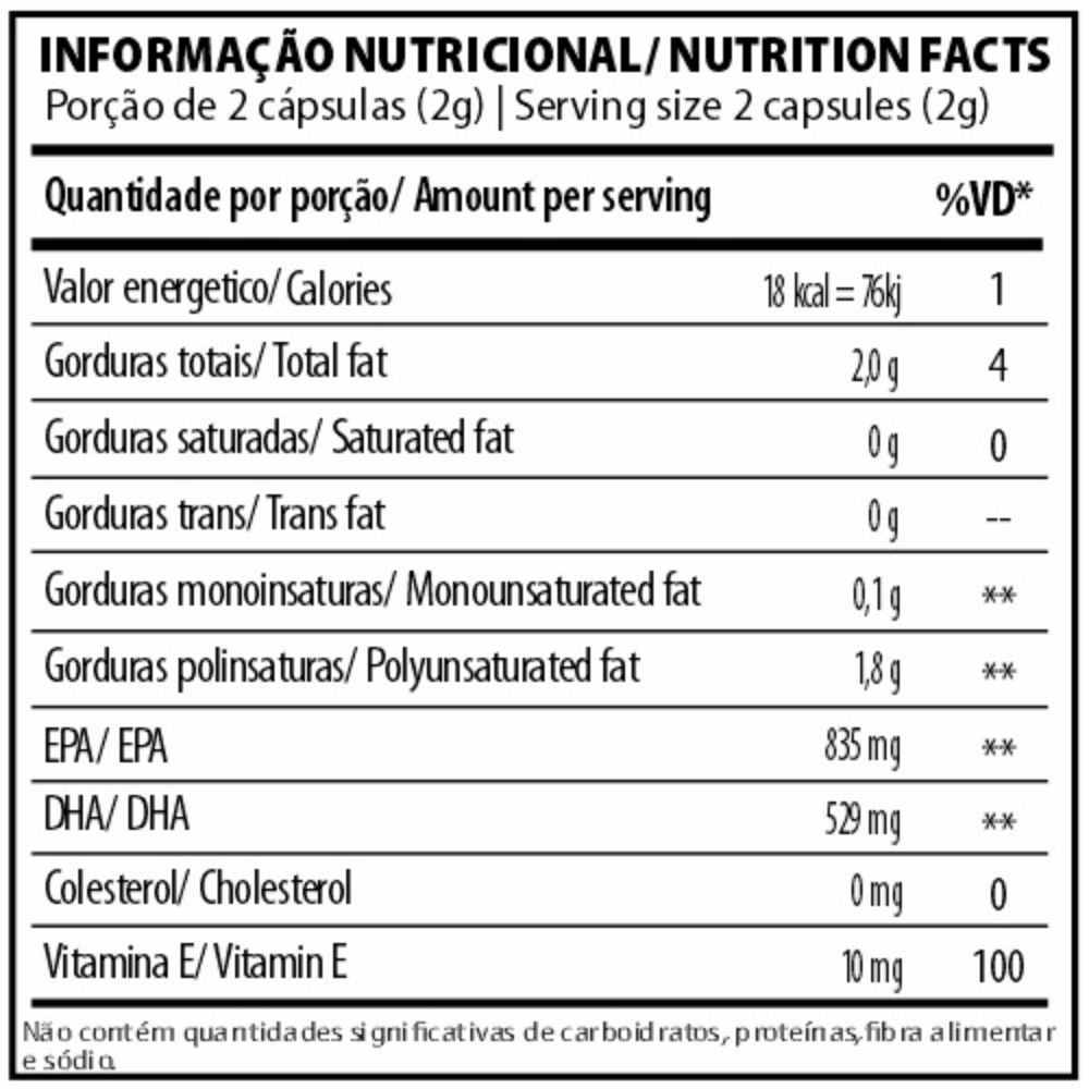 ***ALÉRGICOS NÃO CONTÉM GLÚTEN. CONTÉM DERIVADOS DE PEIXE.*** Omega Pro+ é um suplemento a base de óleo de peixe com alta concentração de ômega 3 EPA e DHA, combinado com vitamina E que evita a oxidação dos ácidos graxos e protege o organismo da ação dos radicais livres. Associado a uma dieta equilibrada, os ácidos graxos ômega 3 auxiliam na redução do risco de doenças cardiovasculares, entre outros benefícios. Omega Pro+ é formulado com alta tecnologia e possui a certificação IFOS de alto grau de pureza e qualidade, além de ser livre de odor. Omega Pro+ está disponível em cápsulas softgel que facilita o consumo diário em todas as fases da vida. ------------------ Benefícios ------------------ → Auxilia na manutenção da saúde cardiovascular → Auxilia na manutenção da saúde cerebral (memória e cognição) → Essencial para a saúde dos olhos → Auxilia no controle dos triglicerídeos → Ação anti-inflamatória e antioxidante → Pele mais saudável ----------------------------- Sugestão De Uso ----------------------------- Recomenda-se a ingestão de 1 (uma) cápsula, 2 (duas) vezes ao dia, preferencialmente junto das refeições para indivíduos acima de 19 anos. --------------------- Ingredientes --------------------- Óleo de peixe EE; Cápsula: água purificada, gelificante (gelatina) e umectante (glicerol). NÃO CONTÉM GLÚTEN. ALÉRGICOS: CONTÉM 1 DERIVADOS DE PEIXE. PODE CONTER DERIVADOS DE SOJA.