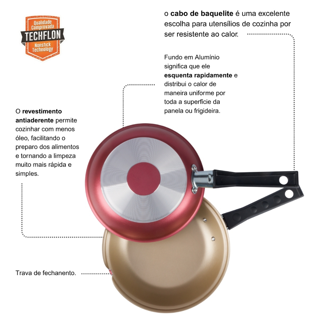 Frigideira Dupla Omeleteira Cereja com Revestimento Antiaderente Bege Nº 18 Para preparar omeletes rápidas e perfeitas, a omeleteira antiaderente tem estrutura de alumínio, que dissipa melhor o calor cozinhando a omelete por igual. O revestimento interno impede as omeletes de grudarem mesmo com uso reduzido de óleo. O material também facilita a limpeza. Sua segurança está garantida com o cabo de baquelite que não aquece Desenvolvida para fazer omeletes, tortillas e frituras em geral, proporcionando dourar os dois lados por igual. Informações Adicionais: - Corpo Alumínio com revestimento antiaderente Techflon interno e externo com 5 camadas. - Os alimentos não grudam. - Fácil de limpar. - Cabo de baquelite antitérmico. Resistentes ao calor, proporcionando maior segurança no manuseio. - Design diferenciado e moderno. Uso Seguro e Adequado: Ao utilizar utensílios quentes, tenha cuidado redobrado. Se necessário, utilize proteção para as mãos e mantenha-os fora do alcance das crianças. Para sua maior segurança, ao utilizar utensílios com cabos, mantenha os sempre voltados para o centro do fogão. Instruções De Uso: Os utensílios com antiaderente Techflon terão maior durabilidade se as instruções abaixo forem seguidas. Antes de Usar: Lave interna e externamente o utensílio, usando apenas uma esponja macia, sabão neutro ou detergente líquido. Enxugue bem com um pano seco e unte as partes internas com óleo ou gordura. Leve ao fogo baixo por um ou dois minutos. Deixe a peça esfriar, lave e enxugue. Durante o Uso: Evite esquentar demais o utensílio vazio. Use o seu utensílio sempre em fogo baixo ou médio para reter o valor nutritivo dos alimentos e conservar o antiaderente. Os utensílios com antiaderente não podem ser aquecidos a temperaturas superiores a 350C. Para mexer ou tirar o alimento, use somente utensílios de nylon ou silicone. Nunca corte alimentos diretamente no revestimento antiaderente. Limpeza: Evite a imersão do utensílio quente em água fria. Deixe o utensílio esfriar antes de lavar. Mesmo depois de vários usos nunca utilize produtos abrasivos na lavagem, como saponáceos ou palhas de aço. Se deixar queimar alimentos, deixe seu produto de molho em água durante algum tempo antes de lavá-lo, assim terá a vida útil do produto sempre conservado. Dimensões aproximadas: Altura: 4,2cm Diâmetro: 18cm Comprimento: 34cm Capacidade: 0,9 L